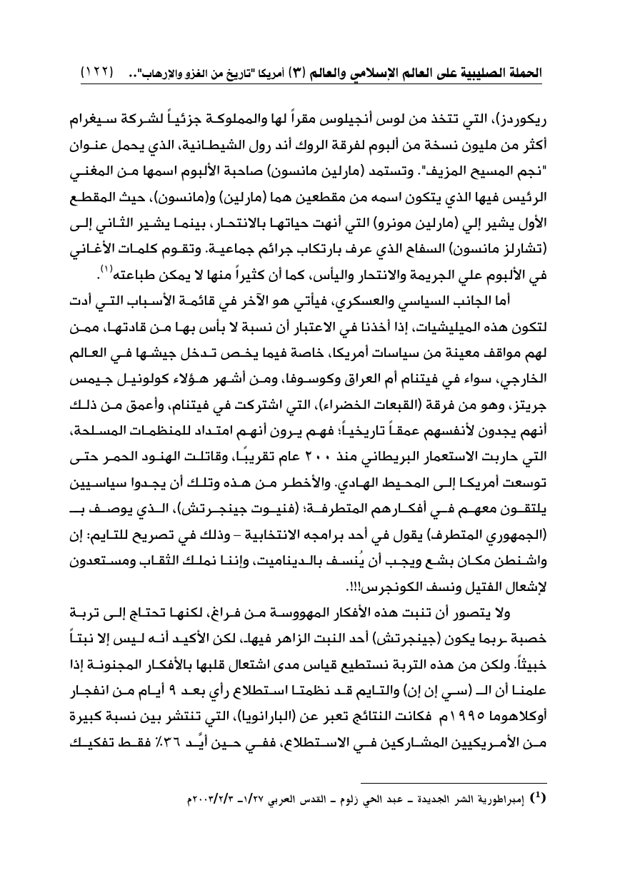 ريكوردز)، التي تتخذ من لوس أنجيلوس مقراً لها والمملوكة جزئياً لشركة سيغرام أكثر من مليون نسخة من ألبوم لفرقة الروك أند رول الشيطانية، الذي يحمل عنوان "نجم المسيح المزيف". وتستمد (مارلين مانسون) صاحبة الألبوم اسمها من المغني الرئيس فيها الذي يتكون اسمه من مقطعين هما (مارلين) و (مانسون)، حيث المقطع الأول يشير إلي (مارلين مونرو) التي أنهت حياتها بالانتحار، بينما يشير الثاني إلى (تشارلز مانسون) السفاح الذي عرف بارتكاب جرائم جماعية. وتقوم كلمات الأغاني في الألبوم علي الجريمة والانتحار واليأس، كما أن كثيراً منها لا يمكن طباعته (¬1).
