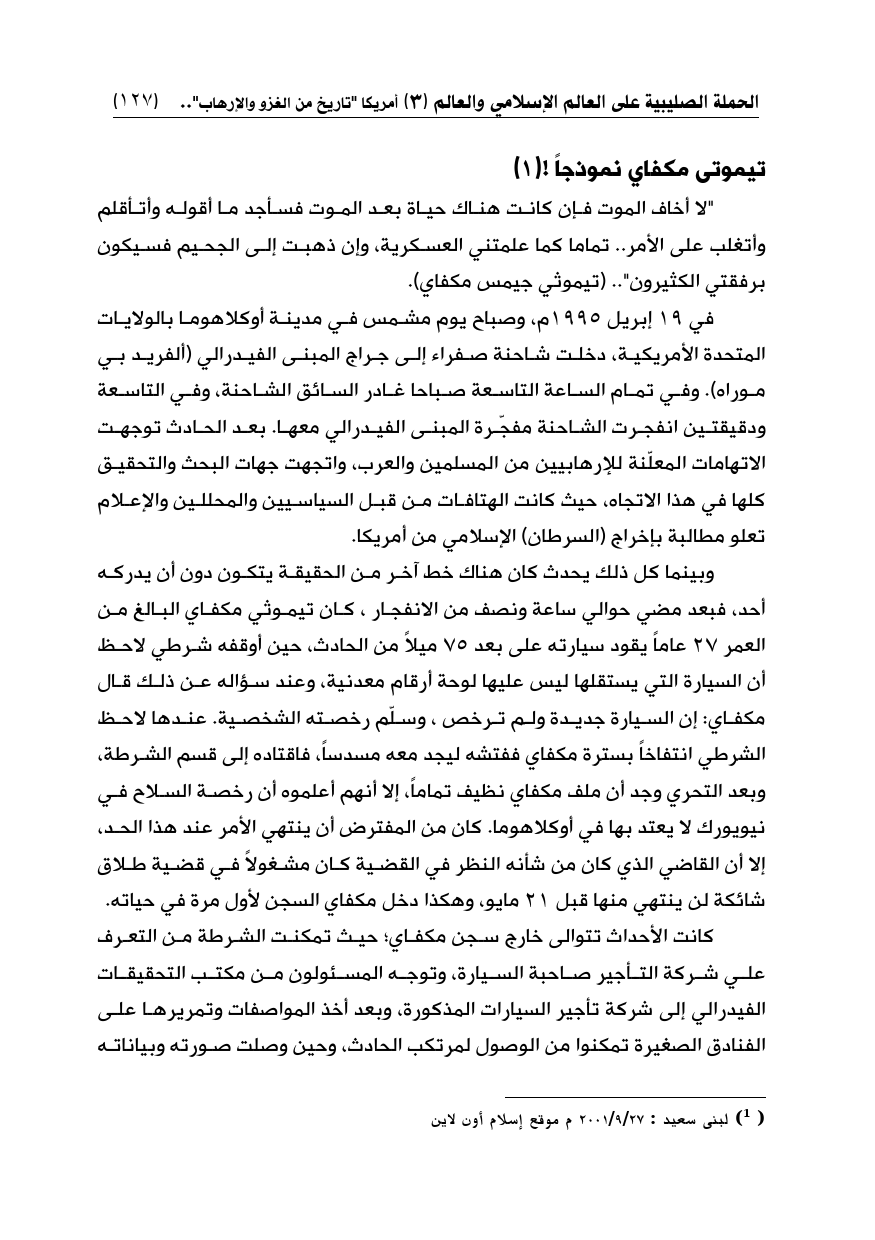 في 19 إبريل 1995م، وصباح يوم مشمس في مدينة أوكلاهوما بالولايات المتحدة الأمريكية، دخلت شاحنة صفراء إلى جراج المبنى الفيدرالي (ألفريد بي موراه). وفي تمام الساعة التاسعة صباحا غادر السائق الشاحنة، وفي التاسعة ودقيقتين انفجرت الشاحنة مفجّرة المبنى الفيدرالي معها. بعد الحادث توجهت الاتهامات المعلّنة للإرهابيين من المسلمين والعرب، واتجهت جهات البحث والتحقيق كلها في هذا الاتجاه، حيث كانت الهتافات من قبل السياسيين والمحللين والإعلام تعلو مطالبة بإخراج (السرطان) الإسلامي من أمريكا.