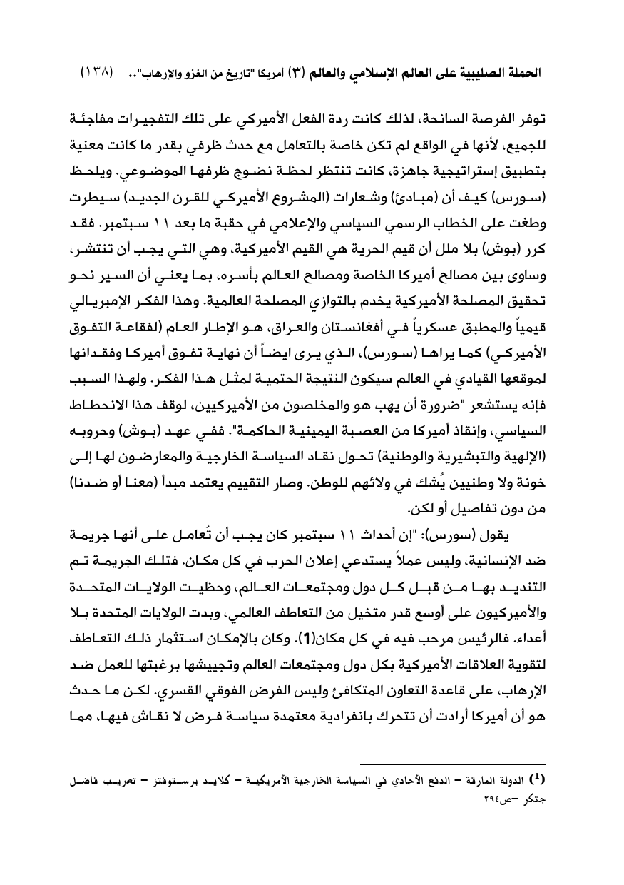 يقول (سورس): "إن أحداث 11 سبتمبر كان يجب أن تُعامل على أنها جريمة ضد الإنسانية, وليس عملاً يستدعي إعلان الحرب في كل مكان. فتلك الجريمة تم التنديد بها من قبل كل دول ومجتمعات العالم، وحظيت الولايات المتحدة والأميركيون على أوسع قدر متخيل من التعاطف العالمي, وبدت الولايات المتحدة بلا أعداء. فالرئيس مرحب فيه في كل مكان (¬1). وكان بالإمكان استثمار ذلك التعاطف لتقوية العلاقات الأميركية بكل دول ومجتمعات العالم وتجييشها برغبتها للعمل ضد الإرهاب، على قاعدة التعاون المتكافئ وليس الفرض الفوقي القسري. لكن ما حدث هو أن أميركا أرادت أن تتحرك بانفرادية معتمدة سياسة فرض لا نقاش فيها، مما