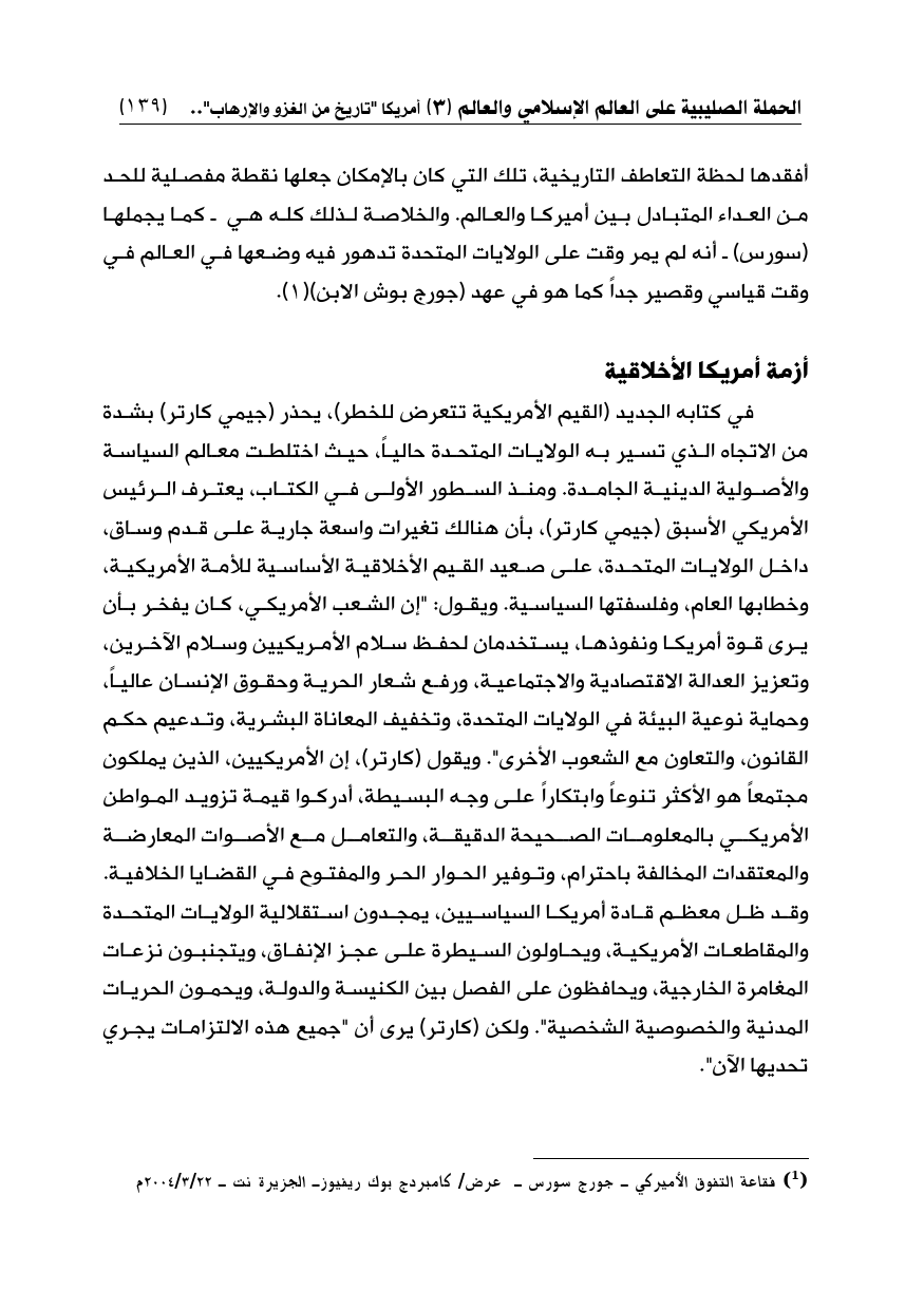 في كتابه الجديد (القيم الأمريكية تتعرض للخطر)، يحذر (جيمي كارتر) بشدة من الاتجاه الذي تسير به الولايات المتحدة حالياً، حيث اختلطت معالم السياسة والأصولية الدينية الجامدة. ومنذ السطور الأولى في الكتاب، يعترف الرئيس الأمريكي الأسبق (جيمي كارتر)، بأن هنالك تغيرات واسعة جارية على قدم وساق، داخل الولايات المتحدة، على صعيد القيم الأخلاقية الأساسية للأمة الأمريكية، وخطابها العام، وفلسفتها السياسية. ويقول: "إن الشعب الأمريكي، كان يفخر بأن يرى قوة أمريكا ونفوذها، يستخدمان لحفظ سلام الأمريكيين وسلام الآخرين، وتعزيز العدالة الاقتصادية والاجتماعية، ورفع شعار الحرية وحقوق الإنسان عالياً، وحماية نوعية البيئة في الولايات المتحدة، وتخفيف المعاناة البشرية، وتدعيم حكم القانون، والتعاون مع الشعوب الأخرى". ويقول (كارتر)، إن الأمريكيين، الذين يملكون مجتمعاً هو الأكثر تنوعاً وابتكاراً على وجه البسيطة، أدركوا قيمة تزويد المواطن الأمريكي بالمعلومات الصحيحة الدقيقة، والتعامل مع الأصوات المعارضة والمعتقدات المخالفة باحترام، وتوفير الحوار الحر والمفتوح في القضايا الخلافية. وقد ظل معظم قادة أمريكا السياسيين، يمجدون استقلالية الولايات المتحدة والمقاطعات الأمريكية، ويحاولون السيطرة على عجز الإنفاق، ويتجنبون نزعات المغامرة الخارجية، ويحافظون على الفصل بين الكنيسة والدولة، ويحمون الحريات المدنية والخصوصية الشخصية". ولكن (كارتر) يرى أن "جميع هذه الالتزامات يجري تحديها الآن".