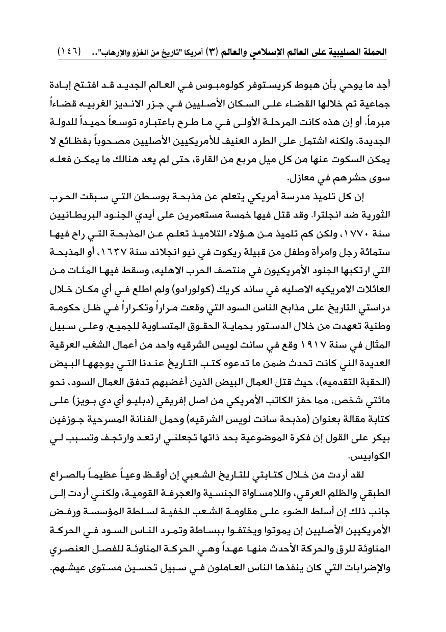 أجد ما يوحي بأن هبوط كريستوفر كولومبوس في العالم الجديد قد افتتح إبادة جماعية تم خلالها القضاء على السكان الأصليين في جزر الانديز الغربيه قضاءاً مبرماً. أو إن هذه كانت المرحلة الأولى في ما طرح باعتباره توسعاً حميداً للدولة الجديدة، ولكنه اشتمل على الطرد العنيف للأمريكيين الأصليين مصحوباً بفظائع لا يمكن السكوت عنها من كل ميل مربع من القارة، حتى لم يعد هنالك ما يمكن فعله سوى حشرهم في معازل.