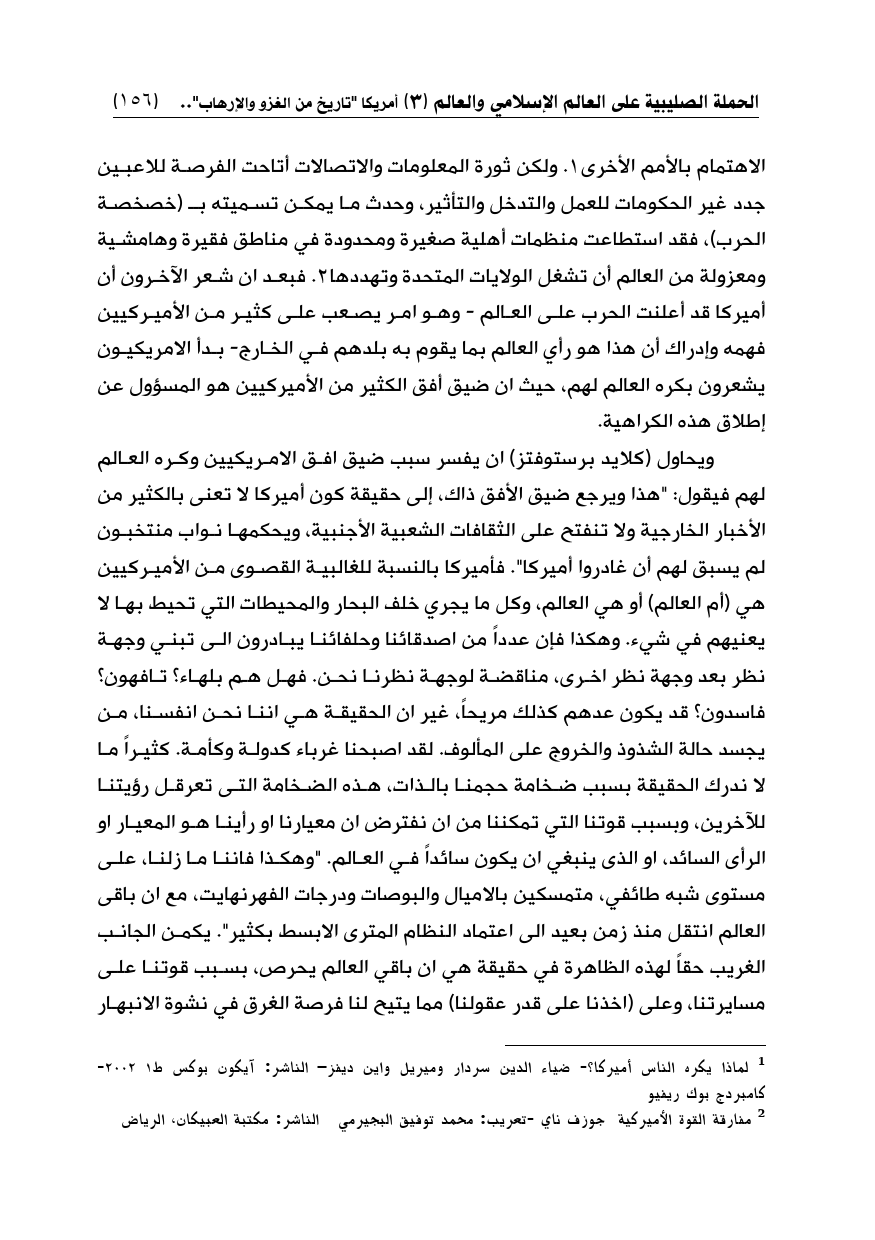 الاهتمام بالأمم الأخرى (¬1). ولكن ثورة المعلومات والاتصالات أتاحت الفرصة للاعبين جدد غير الحكومات للعمل والتدخل والتأثير، وحدث ما يمكن تسميته بـ (خصخصة الحرب)، فقد استطاعت منظمات أهلية صغيرة ومحدودة في مناطق فقيرة وهامشية ومعزولة من العالم أن تشغل الولايات المتحدة وتهددها (¬2). فبعد ان شعر الآخرون أن أميركا قد أعلنت الحرب على العالم - وهو امر يصعب على كثير من الأميركيين فهمه وإدراك أن هذا هو رأي العالم بما يقوم به بلدهم في الخارج- بدأ الأمريكيون يشعرون بكره العالم لهم، حيث ان ضيق أفق الكثير من الأميركيين هو المسؤول عن إطلاق هذه الكراهية.