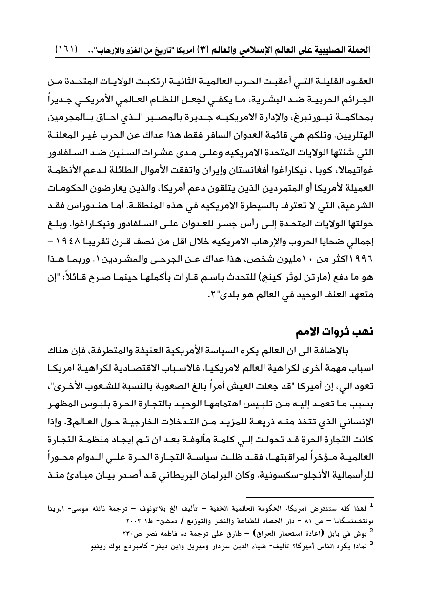العقود القليلة التي أعقبت الحرب العالمية الثانية ارتكبت الولايات المتحدة من الجرائم الحربية ضد البشرية، ما يكفي لجعل النظام العالمي الأمريكي جديراً بمحاكمة نيورنبرغ، والإدارة الأمريكيه جديرة بالمصير الذي احاق بالمجرمين الهتلريين. وتلكم هي قائمة العدوان السافر فقط هذا عداك عن الحرب غير المعلنة التي شنتها الولايات المتحدة الأمريكيه وعلى مدى عشرات السنين ضد السلفادور غواتيمالا، كوبا، نيكاراغوا أفغانستان وإيران واتفقت الأموال الطائلة لدعم الأنظمة العميلة لأمريكا أو المتمردين الذين يتلقون دعم أمريكا، والذين يعارضون الحكومات الشرعية، التي لا تعترف بالسيطرة الأمريكيه في هذه المنطقة. أما هندوراس فقد حولتها الولايات المتحدة إلى رأس جسر للعدوان على السلفادور ونيكاراغوا. وبلغ إجمالي ضحايا الحروب والإرهاب الأمريكيه خلال اقل من نصف قرن تقريبا 1948 - 1996اكثر من 10مليون شخص، هذا عداك عن الجرحى والمشردين (¬1). وربما هذا هو ما دفع (مارتن لوثر كينج) للتحدث باسم قارات بأكملها حينما صرح قائلاً: "إن متعهد العنف الوحيد في العالم هو بلدى" (¬2).