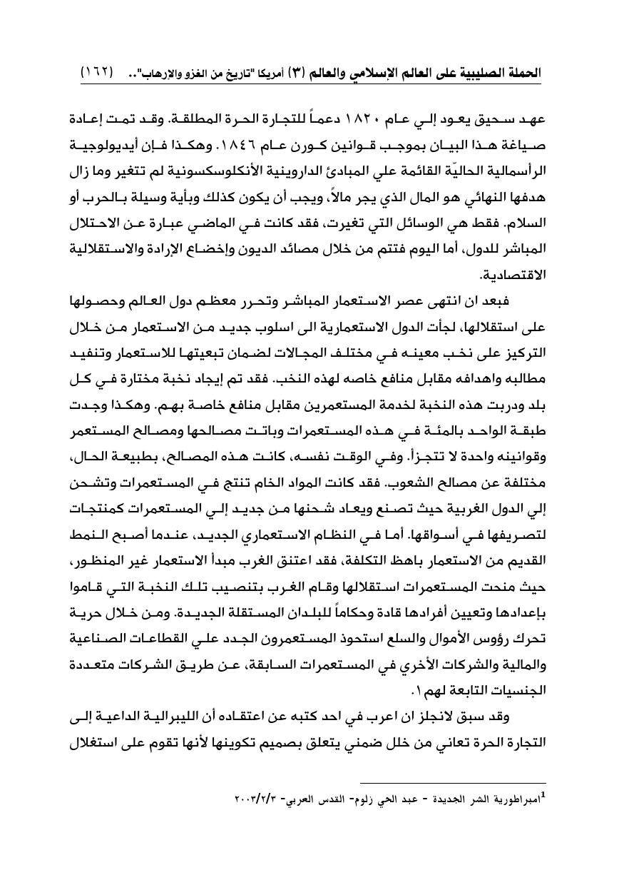 عهد سحيق يعود إلي عام 1820 دعماً للتجارة الحرة المطلقة. وقد تمت إعادة صياغة هذا البيان بموجب قوانين كورن عام 1846. وهكذا فإن أيديولوجية الرأسمالية الحاليّة القائمة علي المبادئ الداروينية الأنكلوسكسونية لم تتغير وما زال هدفها النهائي هو المال الذي يجر مالاً، ويجب أن يكون كذلك وبأية وسيلة بالحرب أو السلام. فقط هي الوسائل التي تغيرت، فقد كانت في الماضي عبارة عن الاحتلال المباشر للدول، أما اليوم فتتم من خلال مصائد الديون وإخضاع الإرادة والاستقلالية الاقتصادية.