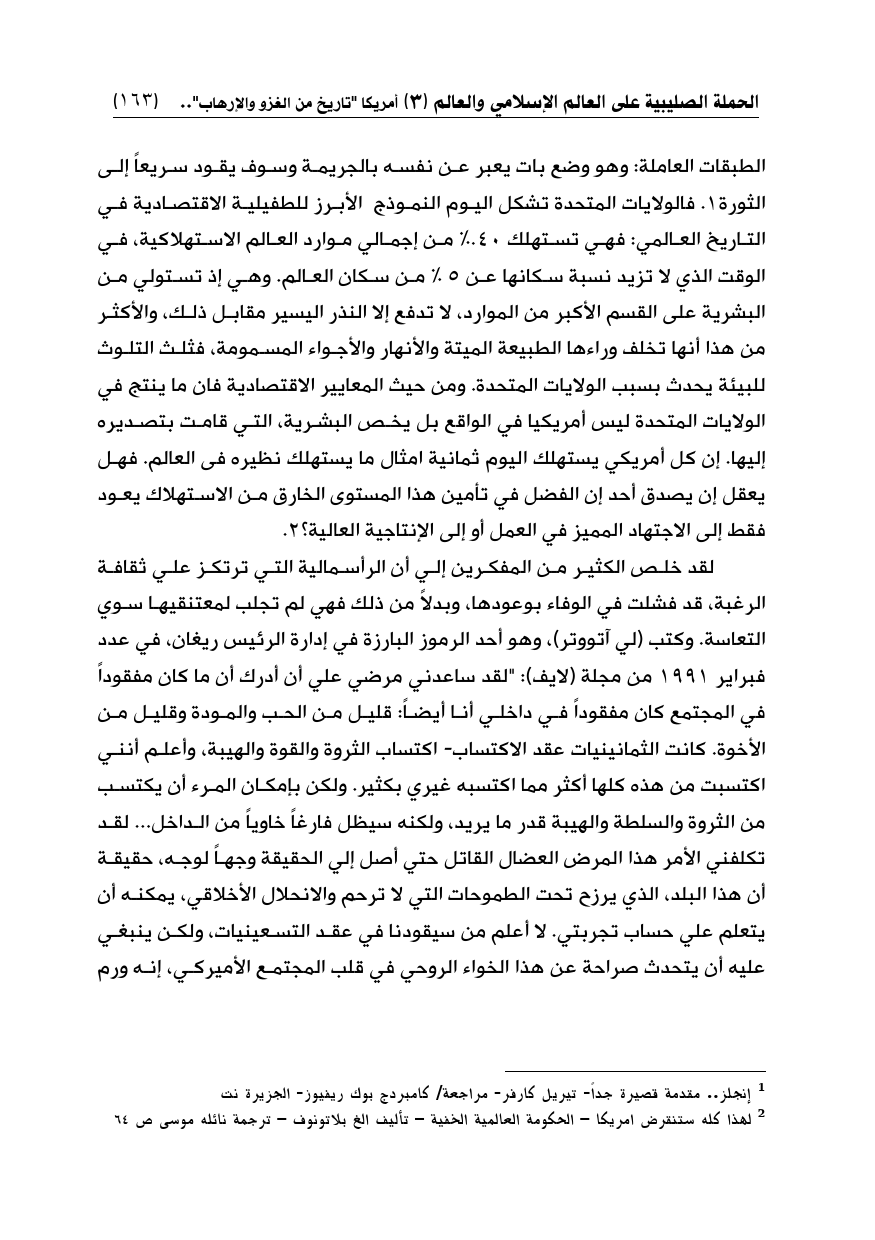 الطبقات العاملة: وهو وضع بات يعبر عن نفسه بالجريمة وسوف يقود سريعاً إلى الثورة (¬1). فالولايات المتحدة تشكل اليوم النموذج الأبرز للطفيلية الاقتصادية في التاريخ العالمي: فهي تستهلك 40.% من إجمالي موارد العالم الاستهلاكية، في الوقت الذي لا تزيد نسبة سكانها عن 5 % من سكان العالم. وهي إذ تستولي من البشرية على القسم الأكبر من الموارد، لا تدفع إلا النذر اليسير مقابل ذلك، والأكثر من هذا أنها تخلف وراءها الطبيعة الميتة والأنهار والأجواء المسمومة، فثلث التلوث للبيئة يحدث بسبب الولايات المتحدة. ومن حيث المعايير الاقتصادية فان ما ينتج في الولايات المتحدة ليس أمريكيا في الواقع بل يخص البشرية، التي قامت بتصديره إليها. إن كل أمريكي يستهلك اليوم ثمانية امثال ما يستهلك نظيره في العالم. فهل يعقل إن يصدق أحد إن الفضل في تأمين هذا المستوى الخارق من الاستهلاك يعود فقط إلى الاجتهاد المميز في العمل أو إلى الإنتاجية العالية؟ (¬2).