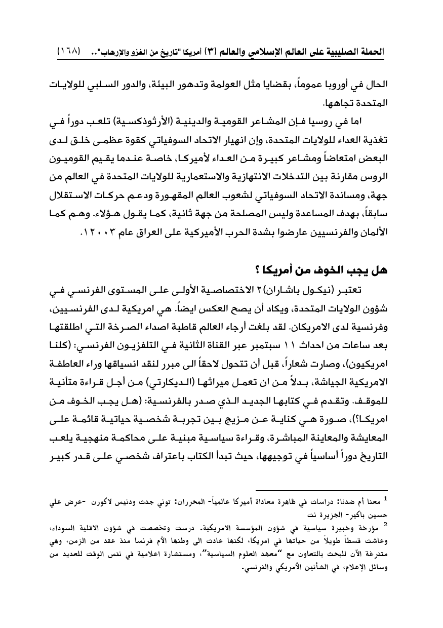 تعتبر (نيكول باشاران) (¬2) الاختصاصية الأولى على المستوى الفرنسي في شؤون الولايات المتحدة، ويكاد أن يصح العكس ايضاً. هي امريكية لدى الفرنسيين، وفرنسية لدى الأمريكان. لقد بلغت أرجاء العالم قاطبة اصداء الصرخة التي اطلقتها بعد ساعات من احداث 11 سبتمبر عبر القناة الثانية في التلفزيون الفرنسي: (كلنا امريكيون)، وصارت شعاراً، قبل أن تتحول لاحقاً إلى مبرر لنقد انسياقها وراء العاطفة الأمريكية الجياشة، بدلاً من ان تعمل ميراثها (الديكارتي) من أجل قراءة متأنية للموقف. وتقدم في كتابها الجديد الذي صدر بالفرنسية: (هل يجب الخوف من أمريكا؟)، صورة هي كناية عن مزيج بين تجربة شخصية حياتية قائمة على المعايشة والمعاينة المباشرة، وقراءة سياسية مبنية على محاكمة منهجية يلعب التاريخ دوراً أساسياً في توجيهها، حيث تبدأ الكتاب باعتراف شخصي على قدر كبير