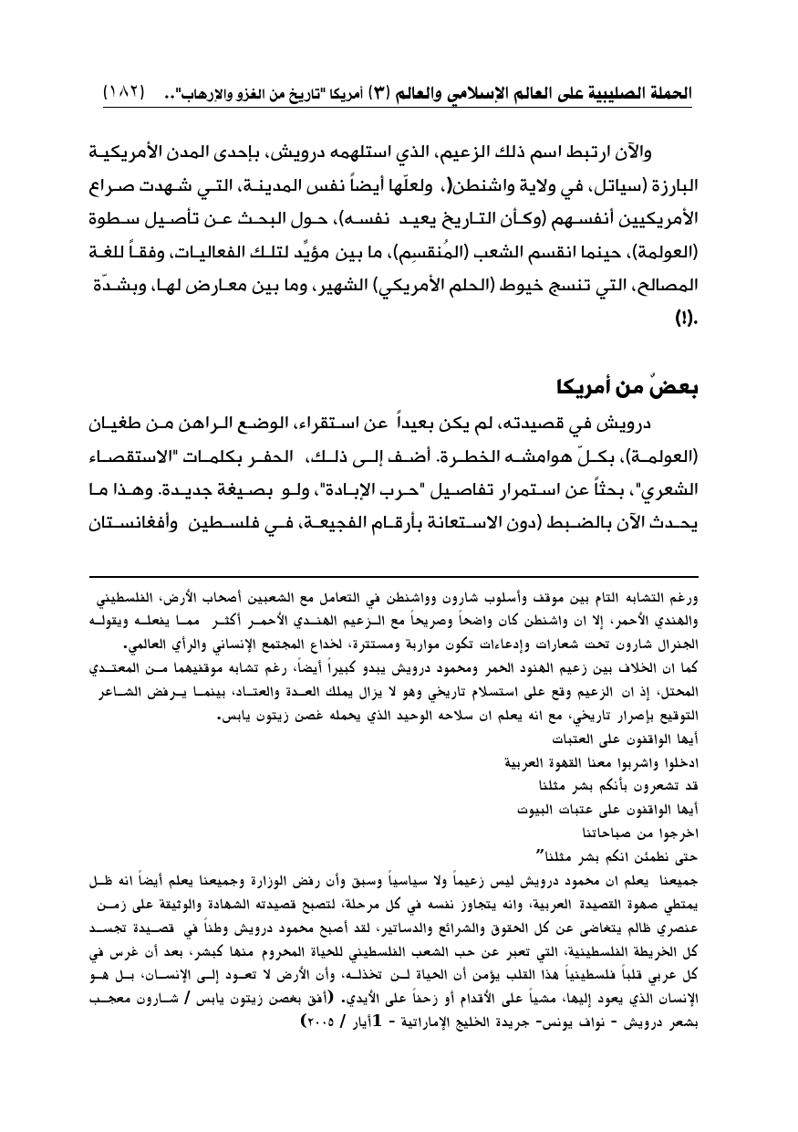 درويش في قصيدته، لم يكن بعيداً عن استقراء، الوضع الراهن من طغيان (العولمة)، بكلّ هوامشه الخطرة. أضف إلى ذلك، الحفر بكلمات "الاستقصاء الشعري"، بحثاً عن استمرار تفاصيل "حرب الإبادة"، ولو بصيغة جديدة. وهذا ما يحدث الآن بالضبط (دون الاستعانة بأرقام الفجيعة، في فلسطين وأفغانستان