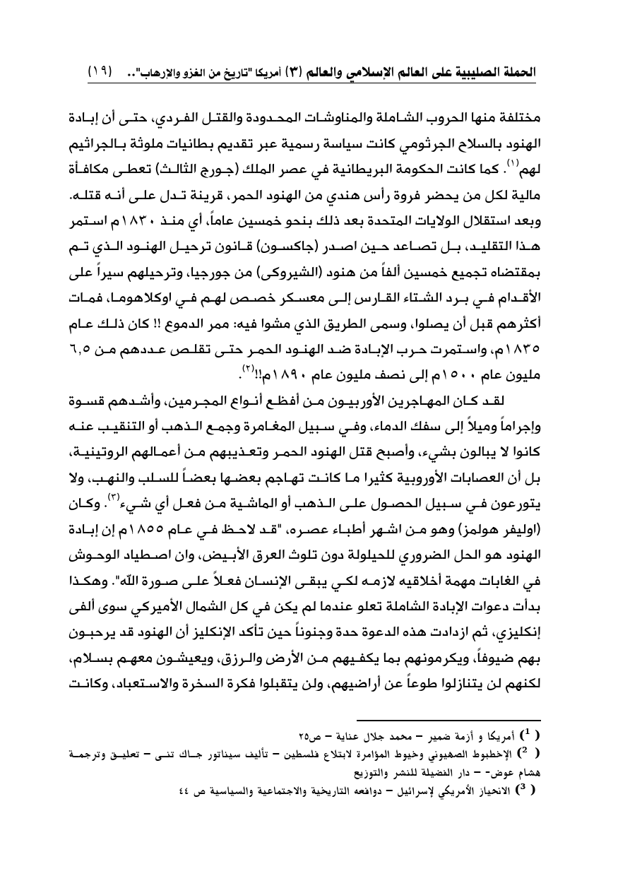 مختلفة منها الحروب الشاملة والمناوشات المحدودة والقتل الفردي، حتى أن إبادة الهنود بالسلاح الجرثومي كانت سياسة رسمية عبر تقديم بطانيات ملوثة بالجراثيم لهم (¬1). كما كانت الحكومة البريطانية في عصر الملك (جورج الثالث) تعطى مكافأة مالية لكل من يحضر فروة رأس هندي من الهنود الحمر، قرينة تدل على أنه قتله. وبعد استقلال الولايات المتحدة بعد ذلك بنحو خمسين عاماً، أي منذ 1830م استمر هذا التقليد، بل تصاعد حين اصدر (جاكسون) قانون ترحيل الهنود الذي تم بمقتضاه تجميع خمسين ألفاً من هنود (الشيروكى) من جورجيا، وترحيلهم سيراً على الأقدام في برد الشتاء القارس إلى معسكر خصص لهم في اوكلاهوما، فمات أكثرهم قبل أن يصلوا، وسمى الطريق الذي مشوا فيه: ممر الدموع!! كان ذلك عام 1835م، واستمرت حرب الإبادة ضد الهنود الحمر حتى تقلص عددهم من 6.5 مليون عام 1500م إلى نصف مليون عام 1890م!! (¬2).