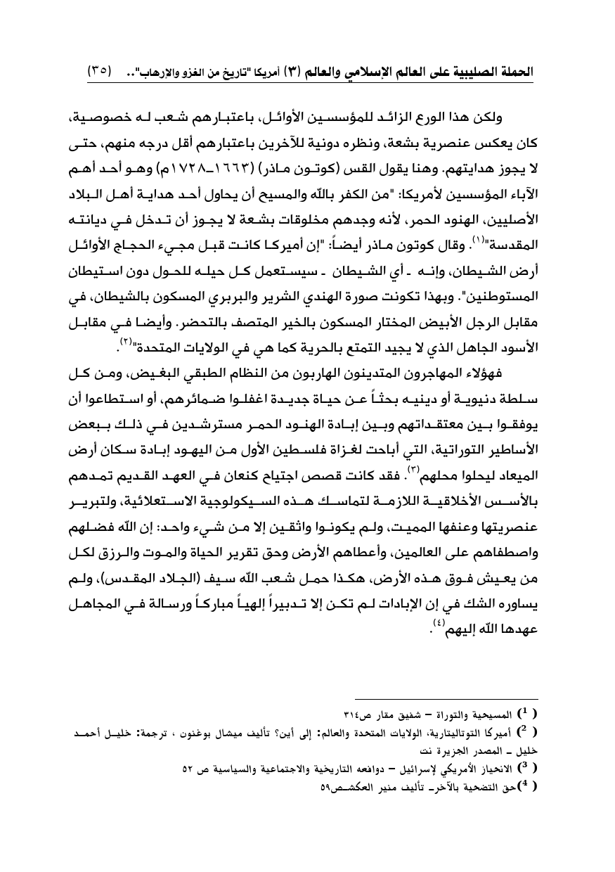 فهؤلاء المهاجرون المتدينون الهاربون من النظام الطبقي البغيض، ومن كل سلطة دنيوية أو دينيه بحثاً عن حياة جديدة اغفلوا ضمائرهم، أو استطاعوا أن يوفقوا بين معتقداتهم وبين إبادة الهنود الحمر مسترشدين في ذلك ببعض الأساطير التوراتية، التي أباحت لغزاة فلسطين الأول من اليهود إبادة سكان أرض الميعاد ليحلوا محلهم (¬3). فقد كانت قصص اجتياح كنعان في العهد القديم تمدهم بالأسس الأخلاقية اللازمة لتماسك هذه السيكولوجية الاستعلائية، ولتبرير عنصريتها وعنفها المميت، ولم يكونوا واثقين إلا من شيء واحد: إن الله فضلهم واصطفاهم على العالمين، وأعطاهم الأرض وحق تقرير الحياة والموت والرزق لكل من يعيش فوق هذه الأرض، هكذا حمل شعب الله سيف (الجلاد المقدس)، ولم يساوره الشك في إن الإبادات لم تكن إلا تدبيراً إلهياً مباركاً ورسالة في المجاهل عهدها الله إليهم (¬4).