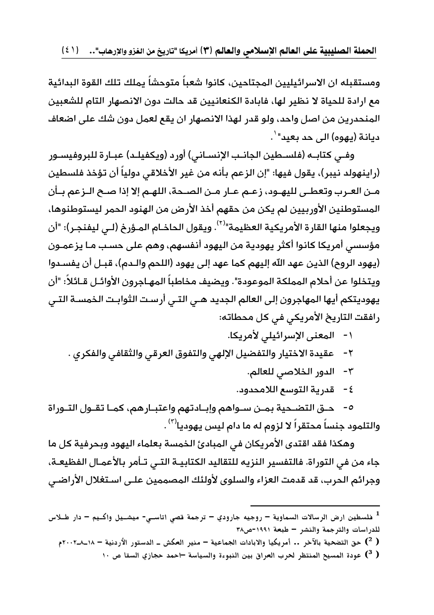 وفي كتابه (فلسطين الجانب الإنساني) أورد (ويكفيلد) عبارة للبروفيسور (راينهولد نيبر)، يقول فيها: "إن الزعم بأنه من غير الأخلاقي دولياً أن تؤخذ فلسطين من العرب وتعطى لليهود، زعم عار من الصحة، اللهم إلا إذا صح الزعم بأن المستوطنين الأوربيين لم يكن من حقهم أخذ الأرض من الهنود الحمر ليستوطنوها، ويجعلوا منها القارة الأمريكية العظيمة" (¬2). ويقول الحاخام المؤرخ (لي ليفنجر): "أن مؤسسي أمريكا كانوا أكثر يهودية من اليهود أنفسهم، وهم على حسب ما يزعمون (يهود الروح) الذين عهد الله إليهم كما عهد إلى يهود (اللحم والدم)، قبل أن يفسدوا ويتخلوا عن أحلام المملكة الموعودة". ويضيف مخاطباً المهاجرون الأوائل قائلاً: "أن يهوديتكم أيها المهاجرون إلى العالم الجديد هي التي أرست الثوابت الخمسة التي رافقت التاريخ الأمريكي في كل محطاته: