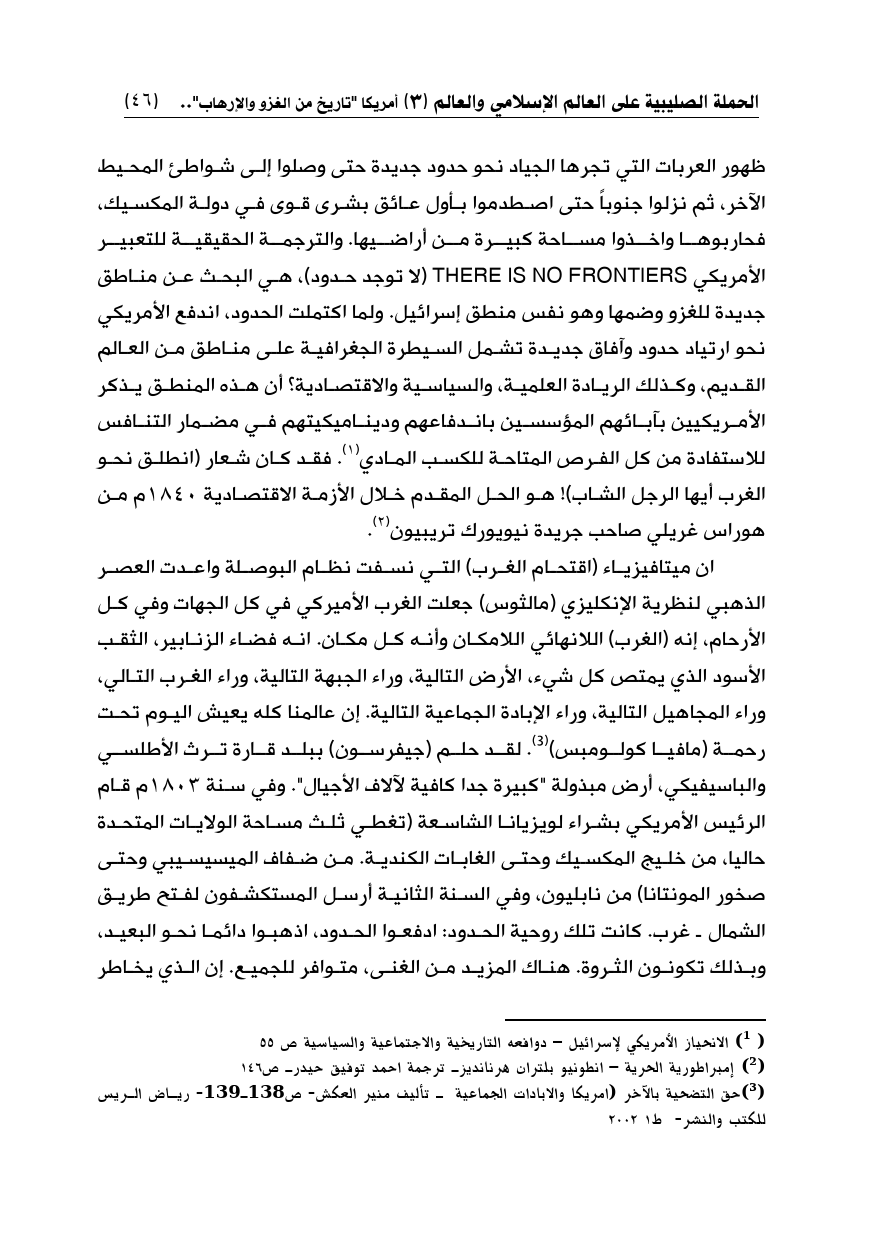 ظهور العربات التي تجرها الجياد نحو حدود جديدة حتى وصلوا إلى شواطئ المحيط الآخر، ثم نزلوا جنوباً حتى اصطدموا بأول عائق بشرى قوى في دولة المكسيك، فحاربوها واخذوا مساحة كبيرة من أراضيها. والترجمة الحقيقية للتعبير الأمريكي THERE IS NO FRONTIERS ( لا توجد حدود)، هي البحث عن مناطق جديدة للغزو وضمها وهو نفس منطق إسرائيل. ولما اكتملت الحدود، اندفع الأمريكي نحو ارتياد حدود وآفاق جديدة تشمل السيطرة الجغرافية على مناطق من العالم القديم، وكذلك الريادة العلمية، والسياسية والاقتصادية؟ أن هذه المنطق يذكر الأمريكيين بآبائهم المؤسسين باندفاعهم وديناميكيتهم في مضمار التنافس للاستفادة من كل الفرص المتاحة للكسب المادي (¬1). فقد كان شعار (انطلق نحو الغرب أيها الرجل الشاب)! هو الحل المقدم خلال الأزمة الاقتصادية 1840م من هوراس غريلي صاحب جريدة نيويورك تريبيون (¬2).