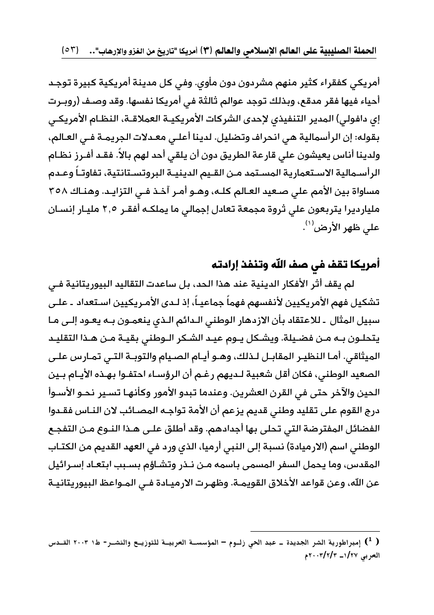 أمريكي كفقراء كثير منهم مشردون دون مأوي. وفي كل مدينة أمريكية كبيرة توجد أحياء فيها فقر مدقع، وبذلك توجد عوالم ثالثة في أمريكا نفسها. وقد وصف (روبرت إي دافولي) المدير التنفيذي لإحدى الشركات الأمريكية العملاقة، النظام الأمريكي بقوله: إن الرأسمالية هي انحراف وتضليل. لدينا أعلي معدلات الجريمة في العالم، ولدينا أناس يعيشون علي قارعة الطريق دون أن يلقي أحد لهم بالاً. فقد أفرز نظام الرأسمالية الاستعمارية المستمد من القيم الدينية البروتستانتية، تفاوتاً وعدم مساواة بين الأمم علي صعيد العالم كله، وهو أمر آخذ في التزايد. وهناك 358 مليارديرا يتربعون علي ثروة مجمعة تعادل إجمالي ما يملكه أفقر 2.5 مليار إنسان علي ظهر الأرض (¬1).