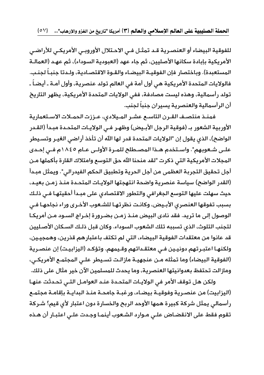 فمنذ منتصف القرن التاسع عشر الميلادي، عززت الحملات الاستعمارية الأوربية الشعور بـ (فوقية الرجل الأبيض) وظهر في الولايات المتحدة مبدأ (القدر الواضح)، الذي يقول إن "الولايات المتحدة قدر لها الله أن تأخذ أراضي الغير وتسيطر على شعوبهم". واستخدم هذا المصطلح للمرة الأولى عام 1845م في إحدى المجلات الأمريكية التي ذكرت "لقد منحنا الله حق التوسع وامتلاك القارة بأكملها من أجل تحقيق التجربة العظمى من أجل الحرية وتطبيق الحكم الفيدرالي". ويمثل مبدأ (القدر الواضح) سياسة عنصرية واضحة انتهجتها الولايات المتحدة منذ زمن بعيد، حيث سهلت عليها التوسع الجغرافي والتطور الاقتصادي على مبدأ أحقيتها في ذلك بسبب تفوقها العنصري الأبيض، وكانت نظرتها للشعوب الأخرى وراء نجاحها في الوصول إلى ما تريد. فقد نادى البيض منذ زمن بضرورة إخراج السود من أمريكا لتجنب التلوث، الذي تسببه تلك الشعوب السوداء. وكان قبل ذلك السكان الأصليين قد عانوا من معتقدات الفوقية البيضاء، التي لم تكتف باعتبارهم قذرين، وهمجيين، ولكنها اعتبرتهم دونيين في معتقداتهم وقيمهم. وتؤكد (اليزابيت) إن عنصرية (الفوقية البيضاء) وما تمثله من عنجهية مازالت تسيطر علي المجتمع الأمريكي، ومازالت تحتفظ بعدوانيتها العنصرية، وما يحدث للمسلمين الآن خير مثال على ذلك.