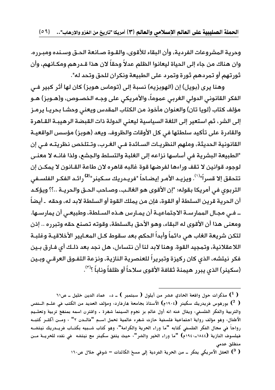 وهنا يرى (بويل) إن (الهوبزيه) نسبة إلى (توماس هوبز) كان لها أثر كبير في الفكر القانوني الدولي الغربي عموماً، والأمريكي على وجه الخصوص، و (هوبز) هو مؤلف كتاب (لويا تان) والعنوان مأخوذ من الكتاب المقدس ويعني وحشا بحريا يرمز إلى الشر، ثم استعير إلى اللغة السياسية ليعني الدولة ذات القبضة الرهيبة القاهرة والقادرة على تأكيد سلطتها في كل الأوقات والظروف. ويعد (هوبز) مؤسس الواقعية القانونية الحديثة، وملهم النظريات السائدة في الغرب، وتتلخص نظريته في إن "الطبيعة البشرية في أساسها نزاعه إلى الغلبة والتسلط والجشع، ولذا فانه لا معنى لوجود قوانين لا تقف وراءها لفرضها قوة غالبه قاهره لان طاعة القانون لا يمكن إن تتحقق إلا قسراً" (¬1). ويزيد الأمر إيضاحاً "فريدريك سكينر" (¬2) رائد الفكر الفلسفي التربوي في أمريكا بقوله: "إن الأقوى هو الغالب، وصاحب الحق والحرية .. ؟؟ ويؤكد أن الحرية قرين السلطة أو القوة، فإن من يملك القوة أو السلطة لابد له، وحقه ـ أيضاً ـ في مجال الممارسة الاجتماعية أن يمارس هذه السلطة، وطبيعي أن يمارسها. ومعنى هذا أن الأقوى له البقاء، وهو الأحق بالسلطة، وقوته تصنع حقه وتبرره ..