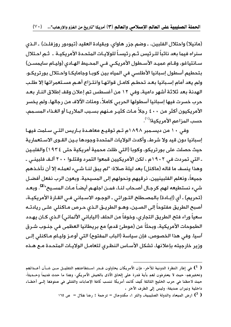 (مانيلا) واحتلال الفلبين، ـ وضم جزر هاواي. وبقيادة العقيد (تيودور روزفلت) ـ الذي سنراه فيما بعد نائباً للرئيس ثم رئيساً للولايات المتحدة الأمريكية ـ ثم احتلال سانتياغو، وقام عميد الأسطول الأمريكي في المحيط الهادي (وليام سايمسن) بتحطيم أسطول إسبانيا الأطلسي في المياه بين كوبا وجامايكا واحتلال بورتريكو. ولم يعد أمام إسبانيا بعد تحطم كامل قواتها وانتزاع أهم مستعمراتها إلا طلب الهدنة بعد ثلاثة أشهر دامية، وفي 12 من أغسطس تم إعلان وقف إطلاق النار بعد حرب خسرت فيها إسبانيا أسطولها الحربي كاملاً، ومئات الآلاف من رجالها، ولم يخسر الأمريكيون أكثر من 400 رجلاً مات كثير منهم بسبب الملاريا أو الغذاء المسمم، حسب المزاعم الأمريكية! (¬1).
