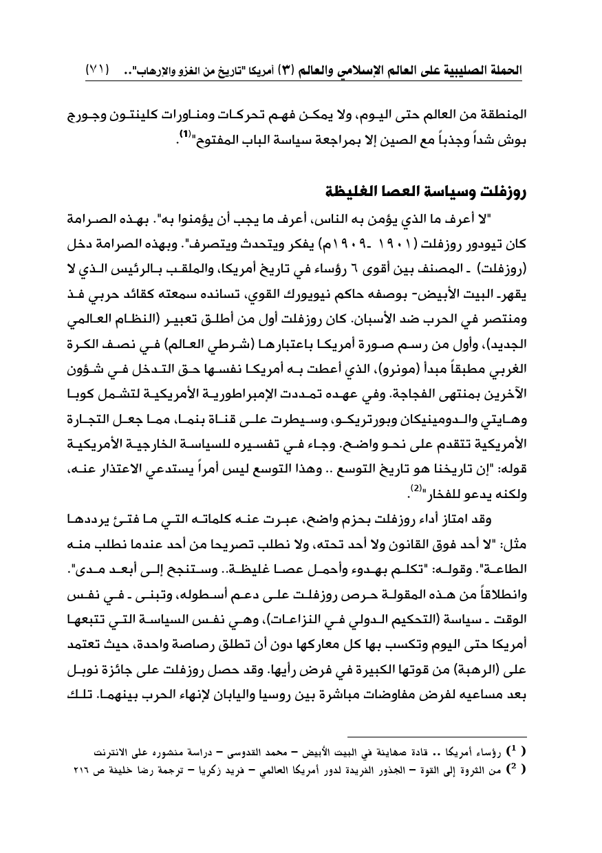 "لا أعرف ما الذي يؤمن به الناس، أعرف ما يجب أن يؤمنوا به". بهذه الصرامة كان تيودور روزفلت (1901 ـ1909م) يفكر ويتحدث ويتصرف". وبهذه الصرامة دخل (روزفلت) ـ المصنف بين أقوى 6 رؤساء في تاريخ أمريكا، والملقب بالرئيس الذي لا يقهرـ البيت الأبيض- بوصفه حاكم نيويورك القوي، تسانده سمعته كقائد حربي فذ ومنتصر في الحرب ضد الأسبان. كان روزفلت أول من أطلق تعبير (النظام العالمي الجديد)، وأول من رسم صورة أمريكا باعتبارها (شرطي العالم) في نصف الكرة الغربي مطبقاً مبدأ (مونرو)، الذي أعطت به أمريكا نفسها حق التدخل في شؤون الآخرين بمنتهى الفجاجة. وفي عهده تمددت الإمبراطورية الأمريكية لتشمل كوبا وهايتي والدومينيكان وبورتريكو، وسيطرت على قناة بنما، مما جعل التجارة الأمريكية تتقدم على نحو واضح. وجاء في تفسيره للسياسة الخارجية الأمريكية قوله: "إن تاريخنا هو تاريخ التوسع .. وهذا التوسع ليس أمراً يستدعي الاعتذار عنه، ولكنه يدعو للفخار" (¬2).