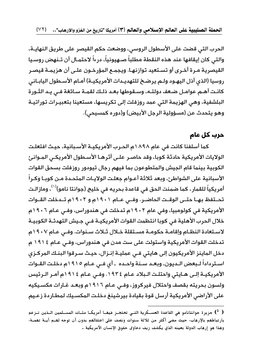 (¬1) جزيرة جوانتانامو هي القاعدة العسكرية التي تحتجز فيها أمريكا مئات المسلمين الذين تزعم بارتباطهم بالإرهاب، حيث مضى أكثر من ثلاثة سنوات ونصف على اعتقالهم بدون أن توجه لهم أية تهمة، وهذا هو إرهاب الدولة بعينه الذي يكشف زيف دعاوى حقوق الإنسان الأمريكية.