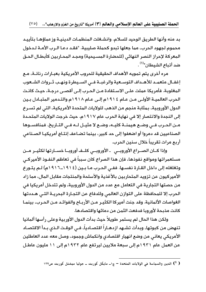 مره أخرى يتم تمويه الأهداف الحقيقية للحروب الأمريكية بعبارات رنانة، مع إغفال متعمد للأهداف التوسعية والرغبة في السيطرة ونهب ثروات الشعوب المغلوبة. فأمريكا عملت على الاستفادة من الحرب إلى أقصى درجة، حيث كانت الحرب العالمية الأولى من عام 1914م إلى عام 1918م والتدمير المتبادل بين الدول الأوروبية، بمثابة منجم من الذهب للولايات المتحدة الأمريكية، التي لم تسرع إلى النجدة والانتصار إلا في نهاية الحرب عام 1917م. حيث خرجت الولايات المتحدة من الحرب في وضع هيمنة كليه، وضع لا مثيل له في التاريخ. فمنافسوها الصناعيين قد دمروا أو اضعفوا إلى حد كبير، بينما تضاعف إنتاج أمريكيا الصناعي أربع مرات تقريباً خلال سنين الحرب.