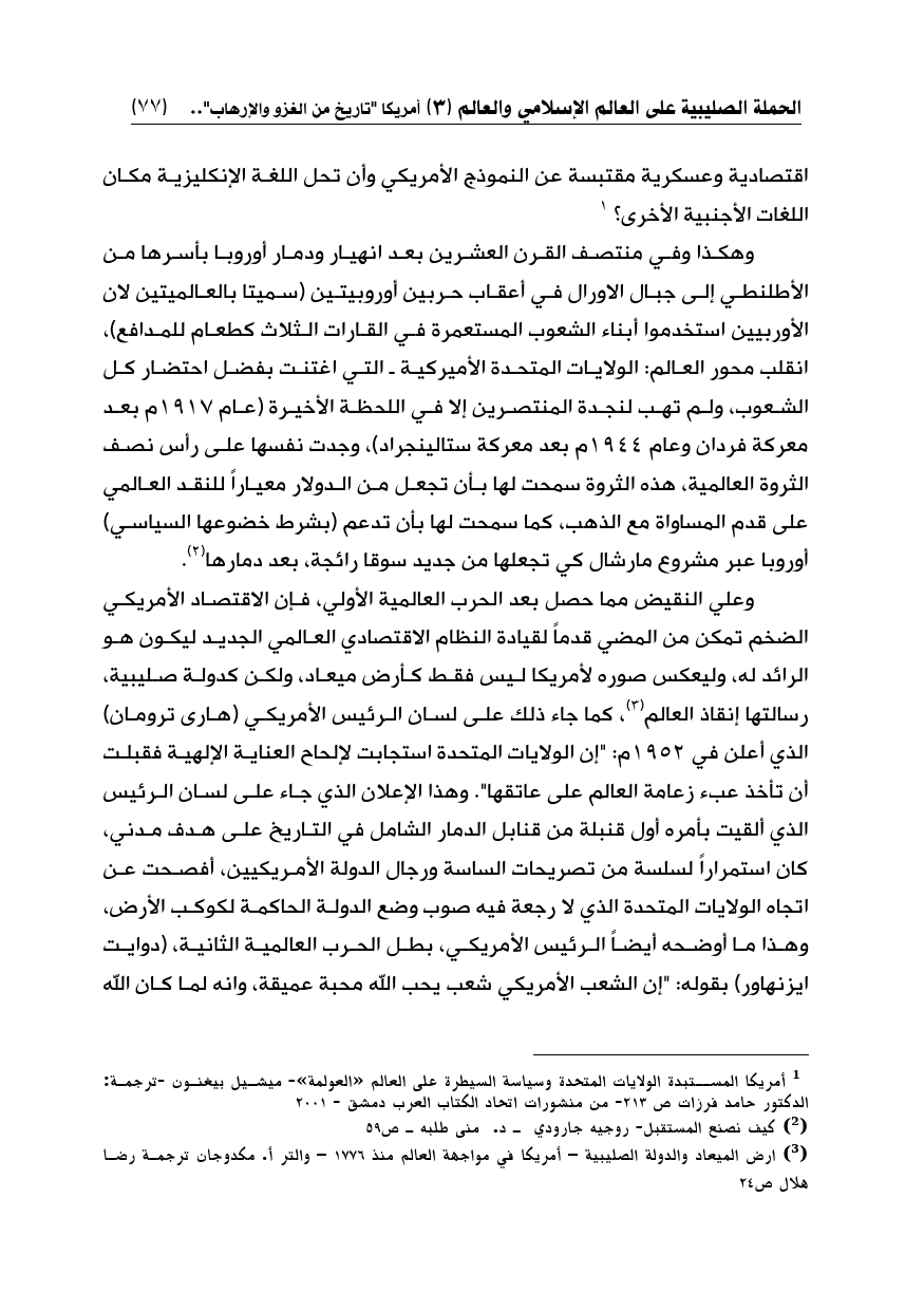 وعلي النقيض مما حصل بعد الحرب العالمية الأولي، فإن الاقتصاد الأمريكي الضخم تمكن من المضي قدماً لقيادة النظام الاقتصادي العالمي الجديد ليكون هو الرائد له، وليعكس صوره لأمريكا ليس فقط كأرض ميعاد، ولكن كدولة صليبية، رسالتها إنقاذ العالم (¬3)، كما جاء ذلك على لسان الرئيس الأمريكي (هارى ترومان) الذي أعلن في 1952م: "إن الولايات المتحدة استجابت لإلحاح العناية الإلهية فقبلت أن تأخذ عبء زعامة العالم على عاتقها". وهذا الإعلان الذي جاء على لسان الرئيس الذي ألقيت بأمره أول قنبلة من قنابل الدمار الشامل في التاريخ على هدف مدني، كان استمراراً لسلسة من تصريحات الساسة ورجال الدولة الأمريكيين، أفصحت عن اتجاه الولايات المتحدة الذي لا رجعة فيه صوب وضع الدولة الحاكمة لكوكب الأرض، وهذا ما أوضحه أيضاً الرئيس الأمريكي، بطل الحرب العالمية الثانية، (دوايت ايزنهاور) بقوله: "إن الشعب الأمريكي شعب يحب الله محبة عميقة، وانه لما كان الله