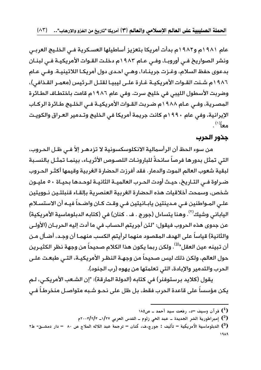 من سوء الحظ أن الرأسمالية الانكلوسكسونية لا تزدهر إلاّ في ظل الحروب، التي تمثل بدورها فرصاً سانحةً للبارونات اللصوص الأثرياء، بينما تمثل بالنسبة لبقية شعوب العالم الموت والدمار. فقد أفرزت الحضارة الغربية وقيمها أكثر الحروب ضراوة في التاريخ، حيث أودت الحرب العالمية الثانية لوحدها بحياة 50 مليون شخص، وسمحت أخلاقيات هذه الحضارة الغربية العنصرية بإلقاء قنبلتين نوويتين علي المواطنين في مدينتين يابانيتين في وقت كان واضحاً فيه أن الاستسلام الياباني وشيك (¬2). وهنا يتساءل (جورج. ف. كنان) في (كتابه الدبلوماسية الأمريكية) عن جدوى هذه الحروب فيقول: "لئن أجريتم الحساب في ما أدت إليه الحربان (الأولى والثانية) قياساً على الهدف المقصود منهما لرأيتم الكسب منهما أن وجد، أضأل من أن تبينه عين العقل" (¬3). ولكن ربما يكون هذا الكلام صحيحاً من وجهة نظر الكثيرين حول العالم، ولكن ذلك ليس صحيحاً من وجهة النظر الأمريكية، التي طبعت على الحرب والتدمير والإبادة، التي تعلمتها من يهوه (رب الجنود).