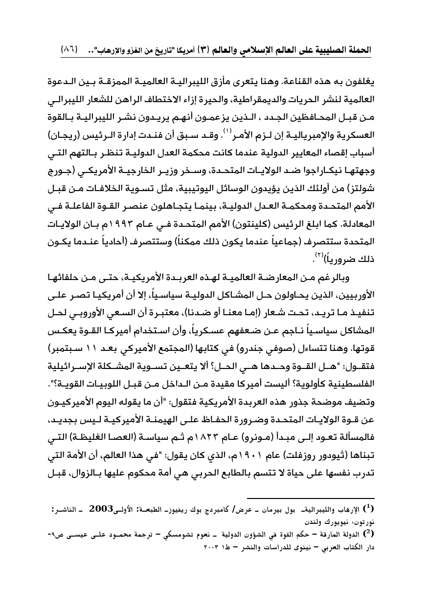 يغلفون به هذه القناعة. وهنا يتعرى مأزق الليبرالية العالمية الممزقة بين الدعوة العالمية لنشر الحريات والديمقراطية, والحيرة إزاء الاختطاف الراهن للشعار الليبرالي من قبل المحافظين الجدد، الذين يزعمون أنهم يريدون نشر الليبرالية بالقوة العسكرية والإمبريالية إن لزم الأمر (¬1). وقد سبق أن فندت إدارة الرئيس (ريجان) أسباب إقصاء المعايير الدولية عندما كانت محكمة العدل الدولية تنظر بالتهم التي وجهتها نيكاراجوا ضد الولايات المتحدة، وسخر وزير الخارجية الأمريكي (جورج شولتز) من أولئك الذين يؤيدون الوسائل اليوتيبية، مثل تسوية الخلافات من قبل الأمم المتحدة ومحكمة العدل الدولية، بينما يتجاهلون عنصر القوة الفاعلة في المعادلة. كما ابلغ الرئيس (كلينتون) الأمم المتحدة في عام 1993م بان الولايات المتحدة ستتصرف (جماعياً عندما يكون ذلك ممكناً) وستتصرف (أحادياً عندما يكون ذلك ضرورياً) (¬2).