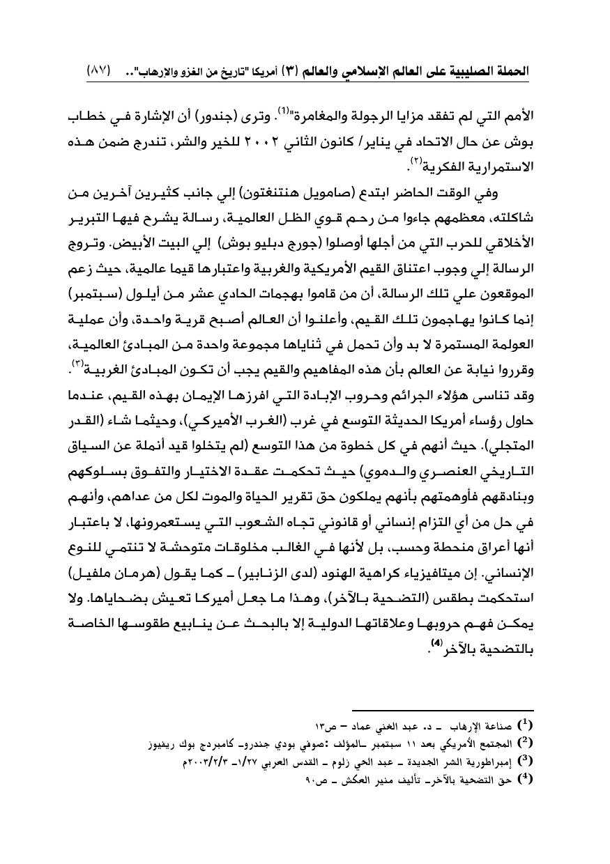 الأمم التي لم تفقد مزايا الرجولة والمغامرة" (¬1). وترى (جندور) أن الإشارة في خطاب بوش عن حال الاتحاد في يناير/ كانون الثاني 2002 للخير والشر، تندرج ضمن هذه الاستمرارية الفكرية (¬2).