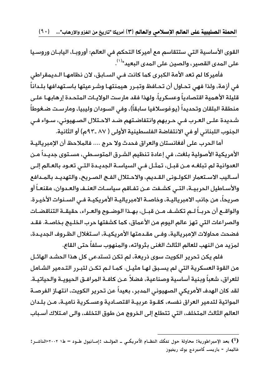فلم يكن تحرير الكويت سوى ذريعة، لم تكن تستدعى كل هذا الحشد الهائل من القوة العسكرية التي لم يسبق لها مثيل. كما لم تكن لتبرر التدمير الشامل للعراق، شعباً وبنية أساسية وصناعية، فضلاً عن كافة المرافق الحيوية والحياتية. لقد كان الهدف الأمريكي الصهيوني المدبر، بعيداً عن تحرير الكويت، انتهاز الفرصة المواتية لتدمير العراق نفسه، كقوة عربية اقتصادية وعسكرية نامية، من بلدان العالم الثالث المتخلف، التي تتطلع إلى الخروج من طوق التخلف، والى امتلاك أسباب