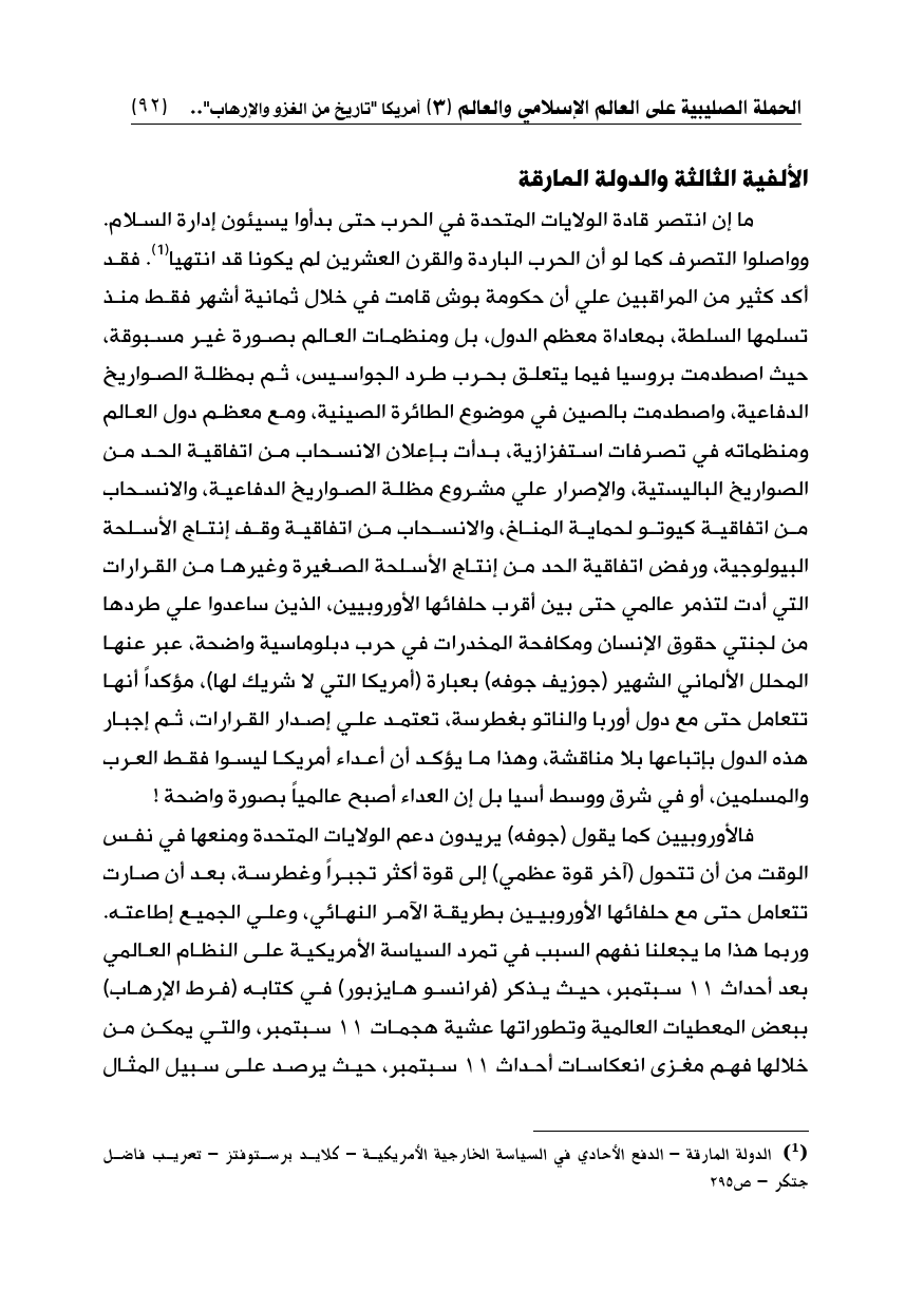 ما إن انتصر قادة الولايات المتحدة في الحرب حتى بدأوا يسيئون إدارة السلام. وواصلوا التصرف كما لو أن الحرب الباردة والقرن العشرين لم يكونا قد انتهيا (¬1). فقد أكد كثير من المراقبين علي أن حكومة بوش قامت في خلال ثمانية أشهر فقط منذ تسلمها السلطة، بمعاداة معظم الدول، بل ومنظمات العالم بصورة غير مسبوقة، حيث اصطدمت بروسيا فيما يتعلق بحرب طرد الجواسيس، ثم بمظلة الصواريخ الدفاعية، واصطدمت بالصين في موضوع الطائرة الصينية، ومع معظم دول العالم ومنظماته في تصرفات استفزازية، بدأت بإعلان الانسحاب من اتفاقية الحد من الصواريخ الباليستية، والإصرار علي مشروع مظلة الصواريخ الدفاعية، والانسحاب من اتفاقية كيوتو لحماية المناخ، والانسحاب من اتفاقية وقف إنتاج الأسلحة البيولوجية، ورفض اتفاقية الحد من إنتاج الأسلحة الصغيرة وغيرها من القرارات التي أدت لتذمر عالمي حتى بين أقرب حلفائها الأوروبيين، الذين ساعدوا علي طردها من لجنتي حقوق الإنسان ومكافحة المخدرات في حرب دبلوماسية واضحة، عبر عنها المحلل الألماني الشهير (جوزيف جوفه) بعبارة (أمريكا التي لا شريك لها)، مؤكداً أنها تتعامل حتى مع دول أوربا والناتو بغطرسة، تعتمد علي إصدار القرارات، ثم إجبار هذه الدول بإتباعها بلا مناقشة، وهذا ما يؤكد أن أعداء أمريكا ليسوا فقط العرب والمسلمين، أو في شرق ووسط أسيا بل إن العداء أصبح عالمياً بصورة واضحة!