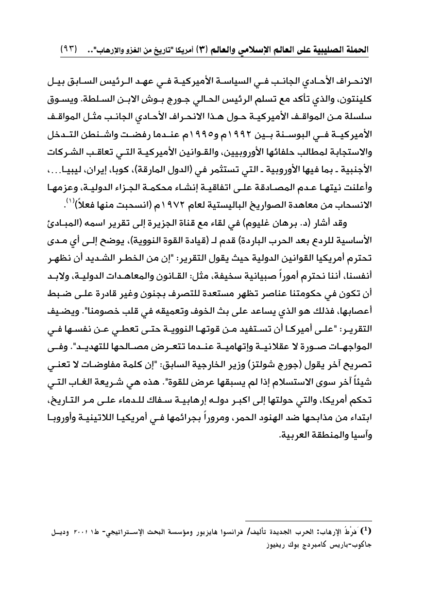 الانحراف الأحادي الجانب في السياسة الأميركية في عهد الرئيس السابق بيل كلينتون، والذي تأكد مع تسلم الرئيس الحالي جورج بوش الابن السلطة. ويسوق سلسلة من المواقف الأميركية حول هذا الانحراف الأحادي الجانب مثل المواقف الأميركية في البوسنة بين 1992م و1995م عندما رفضت واشنطن التدخل والاستجابة لمطالب حلفائها الأوروبيين، والقوانين الأميركية التي تعاقب الشركات الأجنبية ـ بما فيها الأوروبية ـ التي تستثمر في (الدول المارقة)، كوبا، إيران، ليبيا ... ، وأعلنت نيتها عدم المصادقة على اتفاقية إنشاء محكمة الجزاء الدولية، وعزمها الانسحاب من معاهدة الصواريخ الباليستية لعام 1972م (انسحبت منها فعلاً) (¬1).