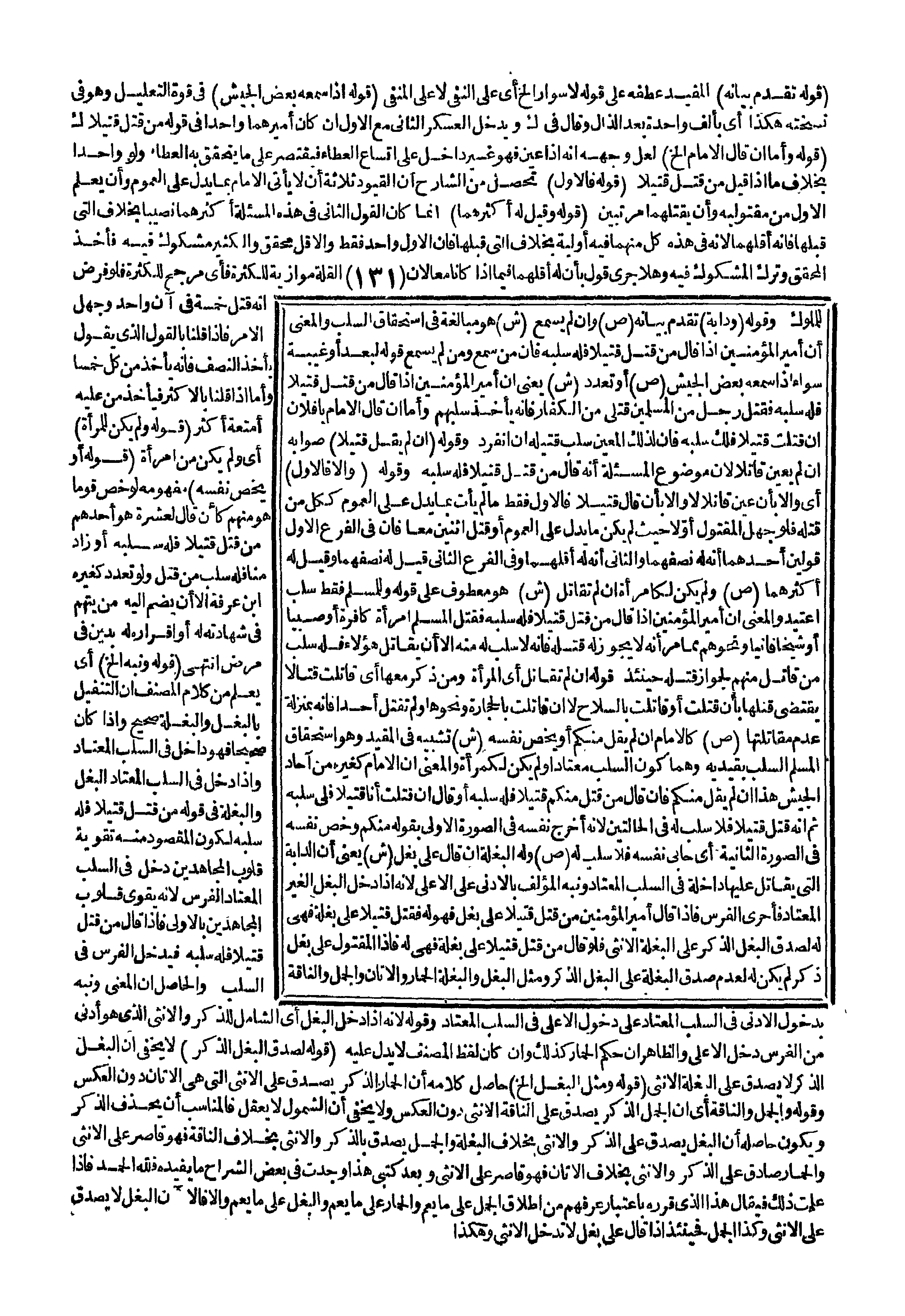 (قَوْلُهُ وَنُبِّهَ إلَخْ) أَيْ يُعْلَمُ مِنْ كَلَامِ الْمُصَنِّفِ أَنَّ التَّنْفِيلَ بِالْبَغْلِ وَالْبَغْلَةِ صَحِيحٌ وَإِذَا كَانَ صَحِيحًا فَهُوَ دَاخِلٌ فِي السَّلَبِ الْمُعْتَادِ وَإِذَا دَخَلَ فِي السَّلَبِ الْمُعْتَادِ الْبَغْلُ وَالْبَغْلَةُ فِي قَوْلِهِ مَنْ قَتَلَ قَتِيلًا فَلَهُ سَلَبُهُ لِكَوْنِ الْمَقْصُودِ مِنْهُ تَقْوِيَةَ قُلُوبِ الْمُجَاهِدِينَ دَخَلَ فِي السَّلَبِ الْمُعْتَادِ الْفَرَسُ؛ لِأَنَّهُ يُقَوِّي قُلُوبَ الْمُجَاهِدِينَ بِالْأَوْلَى فَإِذَا قَالَ مَنْ قَتَلَ قَتِيلًا فَلَهُ سَلَبُهُ فَيَدْخُلُ الْفَرَسُ فِي السَّلَبِ. وَالْحَاصِلُ أَنَّ الْمَعْنَى وَنُبِّهَ بِدُخُولِ الْأَدْنَى فِي السَّلَبِ الْمُعْتَادِ عَلَى دُخُولِ الْأَعْلَى فِي السَّلَبِ الْمُعْتَادِ وَقَوْلُهُ؛ لِأَنَّهُ إذَا دَخَلَ الْبَغْلُ أَيْ الشَّامِلُ لِلذَّكَرِ وَالْأُنْثَى الَّذِي هُوَ أَدْنَى مِنْ الْفَرَسِ دَخَلَ الْأَعْلَى وَالظَّاهِرُ أَنَّ حُكْمَ الْحِمَارِ كَذَلِكَ، وَإِنْ كَانَ لَفْظُ الْمُصَنِّفِ لَا يَدُلُّ عَلَيْهِ (قَوْلُهُ لَصَدَقَ الْبَغْلُ الذَّكَرُ) لَا يَخْفَى أَنَّ الْبَغْلَ الذَّكَرَ لَا يَصْدُقُ عَلَى الْبَغْلَةِ الْأُنْثَى (قَوْلُهُ وَمِثْلُ الْبَغْلِ إلَخْ) حَاصِلُ كَلَامِهِ أَنَّ الْحِمَارَ الذَّكَرَ يَصْدُقُ عَلَى الْأُنْثَى الَّتِي هِيَ الْأَتَانُ دُونَ الْعَكْسِ وَقَوْلُهُ وَالْجَمَلُ وَالنَّاقَةُ أَيِّ أَنَّ الْجَمَلَ الذَّكَرَ يَصْدُقُ عَلَى النَّاقَةِ الْأُنْثَى دُونَ الْعَكْسِ وَلَا يَخْفَى أَنَّ الشُّمُولَ لَا يُعْقَلُ فَالْمُنَاسِبُ أَنْ يُحْذَفَ الذَّكَرُ وَيَكُونُ حَاصِلُهُ أَنَّ الْبَغْلَ يَصْدُقُ عَلَى الذَّكَرِ وَالْأُنْثَى بِخِلَافِ الْبَغْلَةِ وَالْجَمَلِ يَصْدُقُ بِالذَّكَرِ وَالْأُنْثَى بِخِلَافِ النَّاقَةِ فَهُوَ قَاصِرٌ عَلَى الْأُنْثَى وَالْحِمَارُ صَادِقٌ عَلَى الذَّكَرِ وَالْأُنْثَى بِخِلَافِ الْأَتَانِ فَهُوَ قَاصِرٌ عَلَى الْأُنْثَى وَبَعْدَ كَتْبِي هَذَا وَجَدْت فِي بَعْضِ الشُّرَّاحِ مَا يُفِيدُهُ فَلِلَّهِ الْحَمْدُ فَإِذَا عَلِمْت ذَلِكَ فَيُقَالُ هَذَا الَّذِي قَرَّرَهُ بِاعْتِبَارِ عُرْفِهِمْ مِنْ إطْلَاقِ الْجَمَلِ عَلَى مَا يَعُمُّ وَالْحِمَارِ عَلَى مَا يَعُمُّ وَالْبَغْلِ عَلَى مَا يَعُمُّ وَإِلَّا فَالْبَغْلُ لَا يَصْدُقُ عَلَى الْأُنْثَى وَكَذَا الْجَمَلُ فَحِينَئِذٍ إذَا قَالَ عَلَى بَغْلٍ لَا تَدْخُلُ الْأُنْثَى وَهَكَذَا