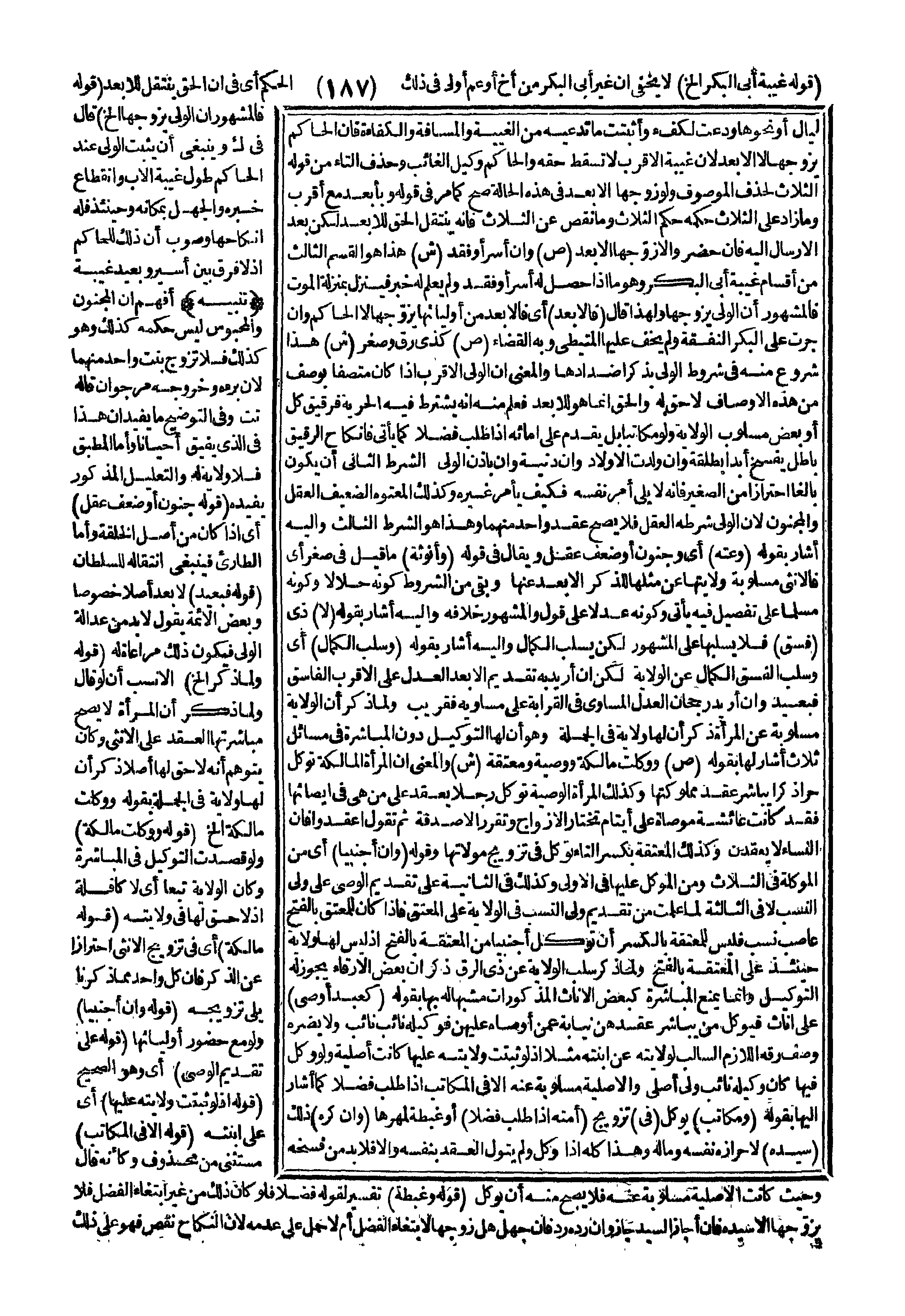 (قَوْلُهُ جُنُونٌ أَوْ ضَعْفُ عَقْلٍ) أَيْ إذَا كَانَ مِنْ أَصْلِ الْخِلْقَةِ. وَأَمَّا الطَّارِئُ فَيَنْبَغِي انْتِقَالُهُ لِلسُّلْطَانِ (قَوْلُهُ فَبَعِيدٌ) لَا بُعْدَ أَصْلًا خُصُوصًا وَبَعْضُ الْأَئِمَّةِ يَقُولُ لَا بُدَّ مِنْ عَدَالَةِ الْوَلِيِّ فَيَكُونُ ذَلِكَ مُرَاعَاةً لَهُ (قَوْلُهُ وَلَمَّا ذَكَرَ إلَخْ) الْأَنْسَبُ أَنْ لَوْ قَالَ وَلَمَّا ذَكَرَ أَنَّ الْمَرْأَةَ لَا يَصِحُّ مُبَاشَرَتُهَا الْعَقْدَ عَلَى الْأُنْثَى وَكَانَ يُتَوَهَّمُ أَنَّهُ لَا حَقَّ لَهَا أَصْلًا ذَكَرَ أَنَّ لَهَا وِلَايَةً فِي الْجُمْلَةِ بِقَوْلِهِ وَوَكَّلَتْ مَالِكَةٌ إلَخْ (قَوْلُهُ وَوَكَّلَتْ مَالِكَةٌ) ، وَلَوْ قَصَدَتْ التَّوْكِيلَ فِي الْمُبَاشَرَةِ وَكَانَتْ الْوِلَايَةُ تَبَعًا أَيْ لَا كَافِلَةً إذْ لَا حَقَّ لَهَا فِي وِلَايَتِهِ (قَوْلُهُ مَالِكَةً) أَيْ فِي تَزْوِيجِ الْأُنْثَى احْتِرَازًا عَنْ الذَّكَرِ فَإِنَّ كُلَّ وَاحِدٍ مِمَّا ذَكَرْنَا يَلِي تَزْوِيجَهُ (قَوْلُهُ، وَإِنْ أَجْنَبِيًّا) ، وَلَوْ مَعَ حُضُورِ أَوْلِيَائِهَا (قَوْلُهُ عَلَى تَقْدِيمِ الْوَصِيِّ) أَيْ وَهُوَ الصَّحِيحُ (قَوْلُهُ إذْ لَوْ ثَبَتَتْ وِلَايَتُهُ عَلَيْهَا) أَيْ عَلَى ابْنَتِهِ (قَوْلُهُ إلَّا فِي الْمُكَاتَبِ) مُسْتَثْنًى مِنْ مَحْذُوفٍ وَكَأَنَّهُ قَالَ وَحَيْثُ كَانَتْ الْأَصْلِيَّةُ مَسْلُوبَةً عَنْهُ فَلَا يَصِحُّ مِنْهُ أَنْ يُوَكِّلَ (قَوْلُهُ وَغِبْطَةً) تَفْسِيرٌ لِقَوْلِهِ فَضْلًا فَلَوْ كَانَ ذَلِكَ مِنْ غَيْرِ ابْتِغَاءِ الْفَضْلِ فَلَا يُزَوِّجُهَا إلَّا سَيِّدُهُ، فَإِنْ أَجَازَ السَّيِّدُ جَازَ، وَإِنْ رَدَّهُ، فَإِنْ جَهِلَ هَلْ زَوَّجَهَا لِابْتِغَاءِ الْفَضْلِ أَمْ لَا حُمِلَ عَلَى عَدَمِهِ؛ لِأَنَّ النِّكَاحَ نَقَصَ فَهُوَ عَلَى ذَلِكَ