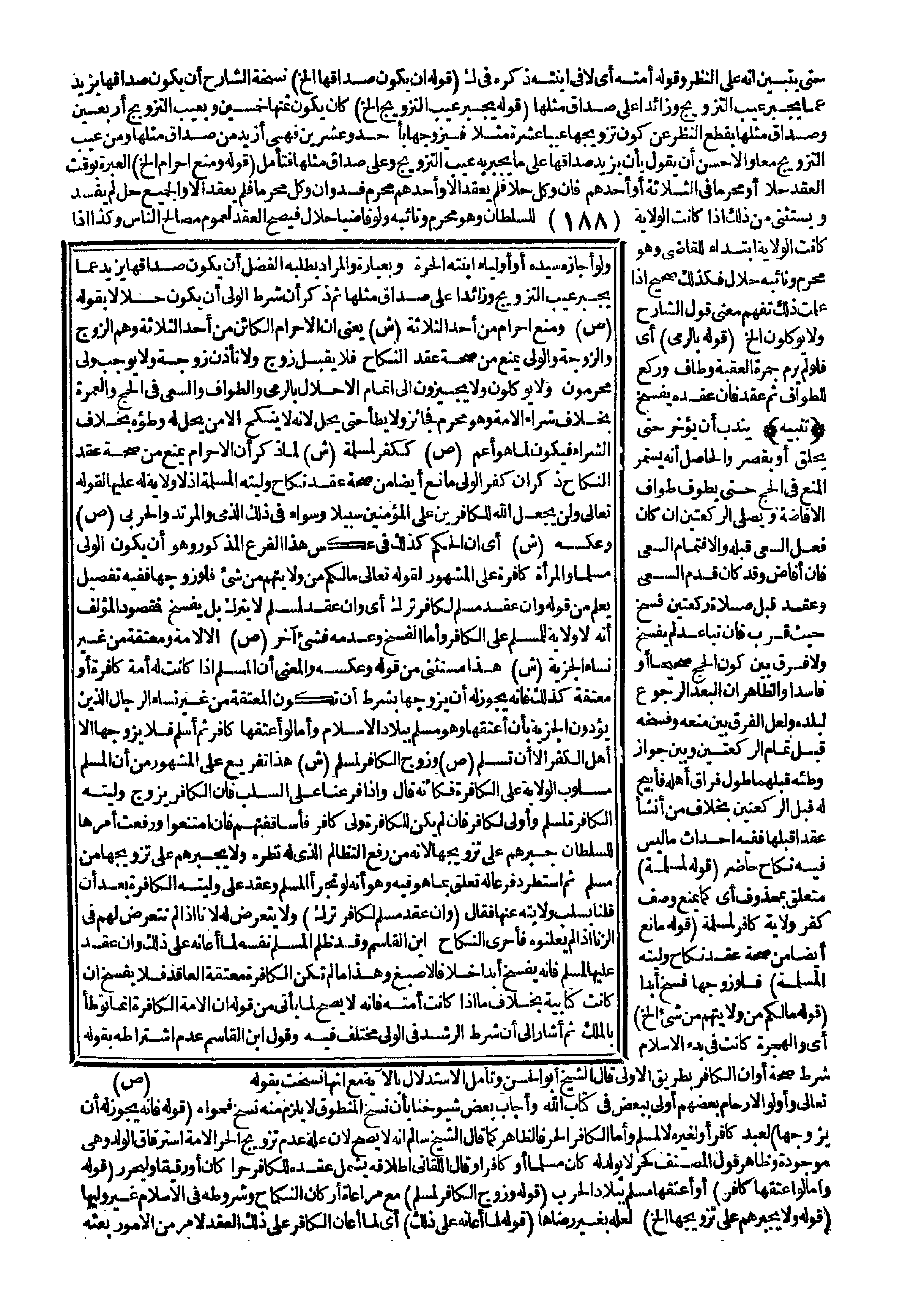 (قَوْلُهُ لِمُسْلِمَةٍ) مُتَعَلِّقٌ بِمَحْذُوفٍ أَيْ كَمَا يَمْنَعُ وَصْفُ كُفْرٍ وِلَايَةَ كَافِرٍ لِمُسْلِمَةٍ (قَوْلُهُ مَانِعٌ أَيْضًا مِنْ صِحَّةِ عَقْدِ نِكَاحِ وَلِيَّتِهِ الْمُسْلِمَةِ) فَلَوْ زَوَّجَهَا فُسِخَ أَبَدًا (قَوْلُهُ {مَا لَكُمْ مِنْ وَلايَتِهِمْ مِنْ شَيْءٍ} [الأنفال: 72] إلَخْ) أَيْ وَالْهِجْرَةُ كَانَتْ فِي بَدْءِ الْإِسْلَامِ شَرْطُ صِحَّةٍ أَوْ أَنَّ الْكَافِرَ بِطَرِيقِ الْأَوْلَى قَالَ الشَّيْخُ أَبُو الْحَسَنِ وَتَأَمَّلْ الِاسْتِدْلَالَ بِالْآيَةِ مَعَ أَنَّهَا نُسِخَتْ بِقَوْلِهِ تَعَالَى {وَأُولُو الأَرْحَامِ بَعْضُهُمْ أَوْلَى بِبَعْضٍ فِي كِتَابِ اللَّهِ} [الأنفال: 75] وَأَجَابَ بَعْضُ شُيُوخِنَا بِأَنَّ نَسْخَ الْمَنْطُوقِ لَا يَلْزَمُ مِنْهُ نَسْخُ فَحَوَاهُ (قَوْلُهُ فَإِنَّهُ يَجُوزُ لَهُ أَنْ يُزَوِّجَهَا) لِعَبْدٍ كَافِرٍ أَوْ لِغَيْرِهِ لَا لِمُسْلِمٍ. وَأَمَّا الْكَافِرُ الْحُرُّ فَالظَّاهِرُ كَمَا قَالَ الشَّيْخُ سَالِمٌ أَنَّهُ لَا يَصِحُّ؛ لِأَنَّ عِلَّةَ عَدَمِ تَزْوِيجِ الْحُرِّ الْأَمَةَ اسْتِرْقَاقُ الْوَلَدِ وَهِيَ مَوْجُودَةٌ وَظَاهِرُ قَوْلِ الْمُصَنِّفِ كَحُرٍّ لَا يُولَدُ لَهُ كَانَ مُسْلِمًا أَوْ كَافِرًا وَقَالَ اللَّقَانِيِّ إطْلَاقُهُ يَشْمَلُ عَقْدَهُ لِلْكَافِرِ حُرًّا كَانَ أَوْ رَقِيقًا وَلْيُحَرَّرْ (قَوْلُهُ. وَأَمَّا لَوْ أَعْتَقَهَا كَافِرٌ) أَوْ أَعْتَقَهَا مُسْلِمٌ بِبِلَادِ الْحَرْبِ.