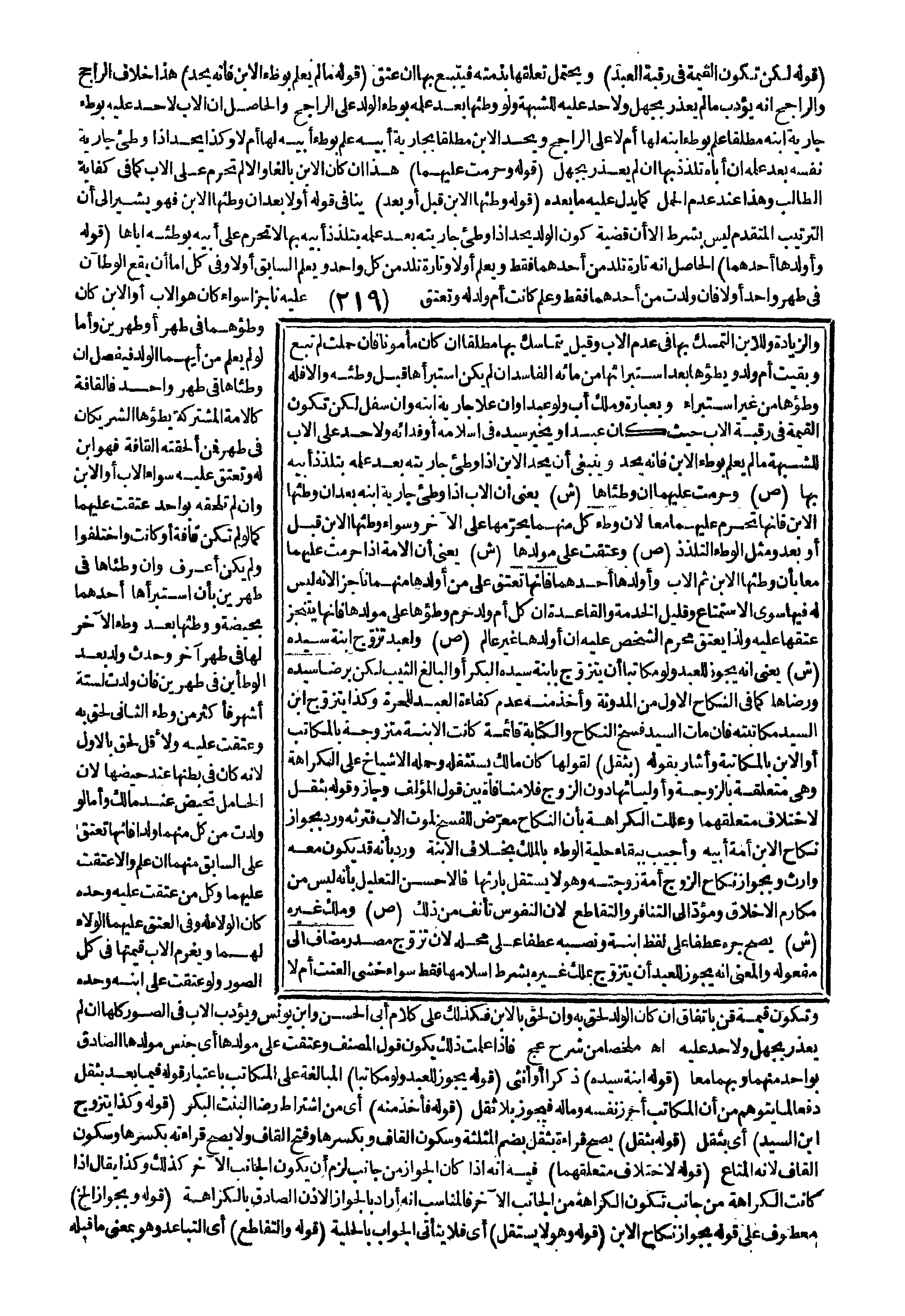 (قَوْلُهُ وَكَذَا يَتَزَوَّجُ ابْنُ السَّيِّدِ) أَيْ بِثِقَلٍ (قَوْلُهُ بِثِقَلٍ) يَصِحُّ قِرَاءَةُ بِثِقَلٍ بِضَمِّ الْمُثَلَّثَةِ وَسُكُونِ الْقَافِ وَبِكَسْرِهَا وَفَتْحِ الْقَافِ وَلَا يَصِحُّ قِرَاءَتُهُ بِكَسْرِهَا وَسُكُونِ الْقَافِ؛ لِأَنَّهُ الْمَتَاعُ (قَوْلُهُ لِاخْتِلَافِ مُتَعَلِّقِهِمَا) فِيهِ أَنَّهُ إذَا كَانَ الْجَوَازُ مِنْ جَانِبٍ لَزِمَ أَنْ يَكُونَ الْجَانِبُ الْآخَرُ كَذَلِكَ وَكَذَا يُقَالُ إذَا كَانَتْ الْكَرَاهَةُ مِنْ جَانِبٍ تَكُونُ الْكَرَاهَةُ مِنْ الْجَانِبِ الْآخَرِ فَالْمُنَاسِبُ أَنَّهُ أَرَادَ بِالْجَوَازِ الْإِذْنَ الصَّادِقَ بِالْكَرَاهَةِ (قَوْلُهُ وَبِجَوَازِ إلَخْ) مَعْطُوفٌ عَلَى قَوْلِهِ بِجَوَازِ نِكَاحِ الِابْنِ (قَوْلُهُ وَهُوَ لَا يَسْتَقِلُّ) أَيْ فَلَا يَتَأَتَّى الْجَوَابُ بِالْحِلِّيَّةِ (قَوْلُهُ وَالتَّقَاطُعِ) أَيْ التَّبَاعُدِ وَهُوَ بِمَعْنَى مَا قَبْلَهُ.