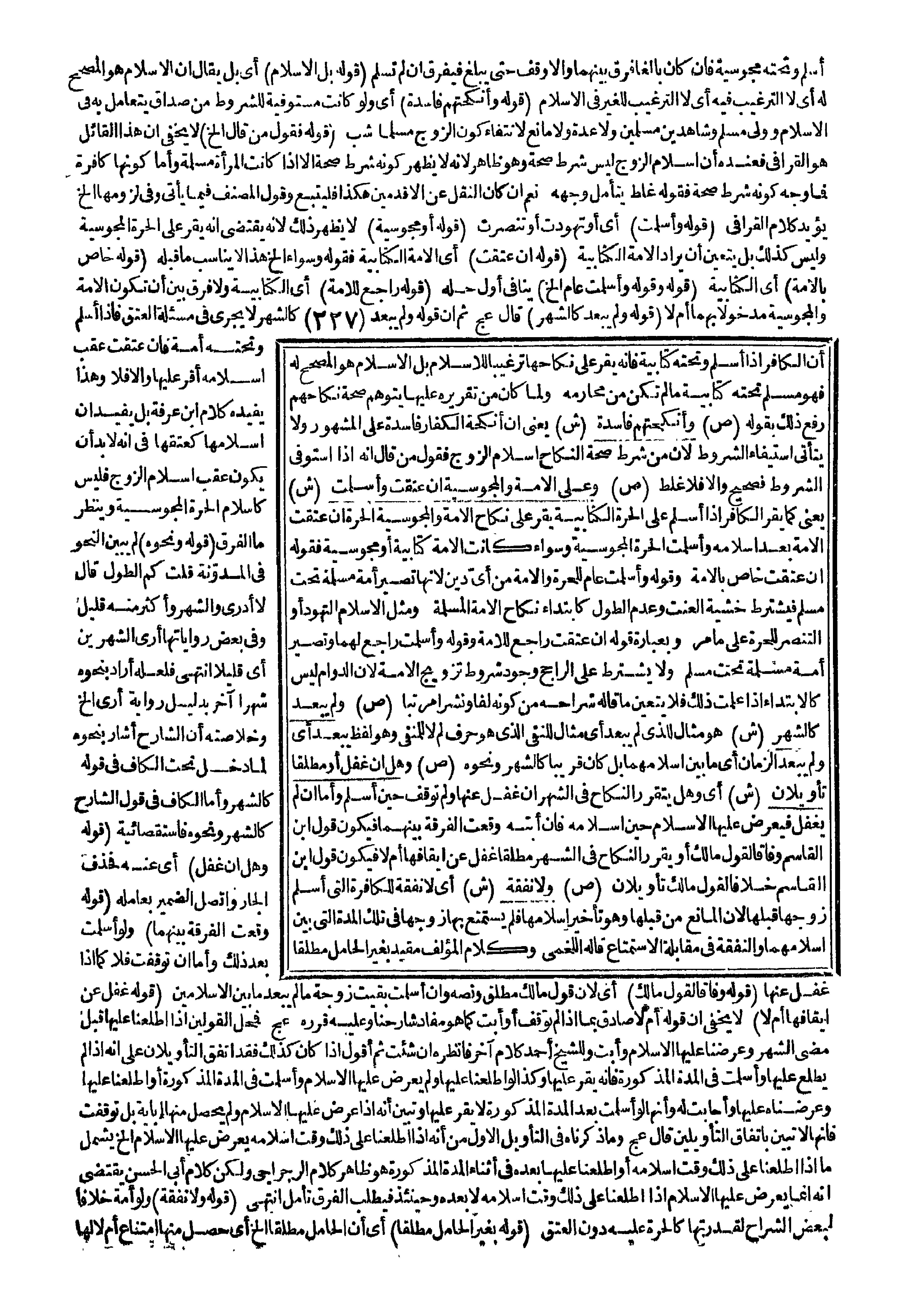 (ص) وَعَلَى الْأَمَةِ وَالْمَجُوسِيَّةِ إنْ عَتَقَتْ وَأَسْلَمَتْ (ش) يَعْنِي كَمَا يُقِرُّ الْكَافِرُ إذَا أَسْلَمَ عَلَى الْحُرَّةِ الْكِتَابِيَّةِ يُقِرُّ عَلَى نِكَاحِ الْأَمَةِ وَالْمَجُوسِيَّةِ الْحُرَّةِ إنْ عَتَقَتْ الْأَمَةُ بَعْدَ إسْلَامِهِ وَأَسْلَمَتْ الْحُرَّةُ الْمَجُوسِيَّةُ وَسَوَاءٌ كَانَتْ الْأَمَةُ كِتَابِيَّةً أَوْ مَجُوسِيَّةً فَقَوْلُهُ إنْ عَتَقَتْ خَاصٌّ بِالْأَمَةِ وَقَوْلُهُ وَأَسْلَمَتْ عَامٌّ لِلْحُرَّةِ وَالْأَمَةِ مِنْ أَيِّ دِينٍ؛ لِأَنَّهَا تَصِيرُ أَمَةً مُسْلِمَةً تَحْتَ مُسْلِمٍ فَيُشْتَرَطُ خَشْيَةُ الْعَنَتِ وَعَدَمُ الطَّوْلِ كَابْتِدَاءِ نِكَاحِ الْأَمَةِ الْمُسْلِمَةِ وَمِثْلُ الْإِسْلَامِ التَّهَوُّدُ أَوْ التَّنَصُّرُ لِلْحُرَّةِ عَلَى مَا مَرَّ وَبِعِبَارَةٍ قَوْلُهُ إنْ عَتَقَتْ رَاجِعٌ لِلْأَمَةِ وَقَوْلُهُ وَأَسْلَمَتْ رَاجِعٌ لَهُمَا وَتَصِيرُ أَمَةً مُسْلِمَةً تَحْتَ مُسْلِمٍ وَلَا يُشْتَرَطُ عَلَى الرَّاجِحِ وُجُودُ شُرُوطِ تَزْوِيجِ الْأَمَةِ؛ لِأَنَّ الدَّوَامَ لَيْسَ كَالِابْتِدَاءِ إذَا عَلِمْت ذَلِكَ فَلَا يَتَعَيَّنُ مَا قَالَهُ شُرَّاحُهُ مِنْ كَوْنِهِ لَفًّا وَنَشْرًا مُرَتَّبًا (ص) وَلَمْ يَبْعُدْ كَالشَّهْرِ (ش) هُوَ مِثَالٌ لِلَّذِي لَمْ يَبْعُدْ أَيْ مِثَالٌ لِلنَّفْيِ الَّذِي هُوَ حَرْفُ لَمْ لَا لِلْمَنْفِيِّ وَهُوَ لَفْظٌ يَبْعُدُ أَيْ وَلَمْ يَبْعُدْ الزَّمَانُ أَيْ مَا بَيْنَ إسْلَامِهِمَا بَلْ كَانَ قَرِيبًا كَالشَّهْرِ وَنَحْوِهِ (ص) وَهَلْ إنْ غَفَلَ أَوْ مُطْلَقًا تَأْوِيلَانِ (ش) أَيْ وَهَلْ يَتَقَرَّرُ النِّكَاحُ فِي الشَّهْرِ إنْ غَفَلَ عَنْهَا وَلَمْ تُوقَفْ حِينَ أَسْلَمَ. وَأَمَّا إنْ لَمْ يَغْفُلْ فَيَعْرِضُ عَلَيْهَا الْإِسْلَامَ حِينَ إسْلَامِهِ، فَإِنْ أَبَتْهُ وَقَعَتْ الْفُرْقَةُ بَيْنَهُمَا فَيَكُونُ قَوْلُ ابْنِ الْقَاسِمِ وِفَاقًا لِقَوْلِ مَالِكٍ أَوْ يُقَرِّرُ النِّكَاحَ فِي الشَّهْرِ مُطْلَقًا غَفَلَ عَنْ إيقَافِهَا أَمْ لَا فَيَكُونُ قَوْلُ ابْنِ الْقَاسِمِ خِلَافًا لِقَوْلِ مَالِكٍ تَأْوِيلَانِ.