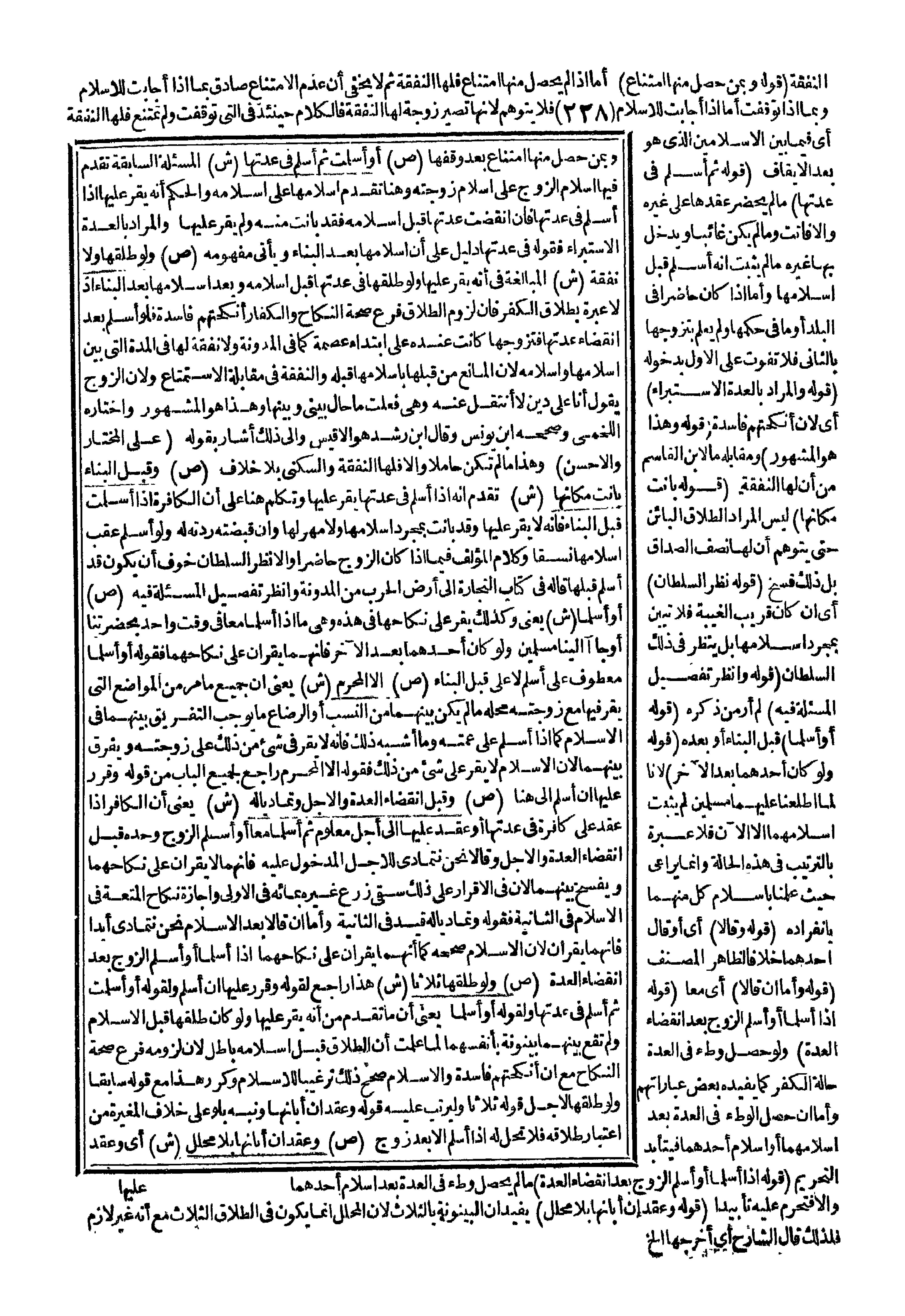 ـــــــــــــــــــــــــــــQالنَّفَقَةُ (قَوْلُهُ وَبِمَنْ حَصَلَ مِنْهَا امْتِنَاعٌ) أَمَّا إذَا لَمْ يَحْصُلْ مِنْهَا امْتِنَاعٌ فَلَهَا النَّفَقَةُ ثُمَّ لَا يَخْفَى أَنَّ عَدَمَ الِامْتِنَاعِ صَادِقٌ بِمَا إذَا أَجَابَتْ لِلْإِسْلَامِ وَبِمَا إذَا تَوَقَّفَتْ أَمَّا إذَا أَجَابَتْ لِلْإِسْلَامِ فَلَا يُتَوَهَّمُ؛ لِأَنَّهَا تَصِيرُ زَوْجَةً لَهَا النَّفَقَةُ فَالْكَلَامُ حِينَئِذٍ فِي الَّتِي تَوَقَّفَتْ وَلَمْ تَمْتَنِعْ فَلَهَا النَّفَقَةُ أَيْ فِيمَا بَيْنَ الْإِسْلَامَيْنِ الَّذِي هُوَ بَعْدَ الْإِيقَافِ (قَوْلُهُ ثُمَّ أَسْلَمَ فِي عِدَّتِهَا) مَا لَمْ يَحْضُرْ عَقْدُهَا عَلَى غَيْرِهِ وَإِلَّا فَاتَتْ وَمَا لَمْ يَكُنْ غَائِبًا وَيَدْخُلُ بِهَا غَيْرُهُ مَا لَمْ يَثْبُتْ أَنَّهُ أَسْلَمَ قَبْلَ إسْلَامِهَا. وَأَمَّا إذَا كَانَ حَاضِرًا فِي الْبَلَدِ أَوْ مَا فِي حُكْمِهَا وَلَمْ يَعْلَمْ بِتَزَوُّجِهَا بِالثَّانِي فَلَا تَفُوتُ عَلَى الْأَوَّلِ بِدُخُولِهِ (قَوْلُهُ وَالْمُرَادُ بِالْعِدَّةِ الِاسْتِبْرَاءُ) أَيْ؛ لِأَنَّ أَنْكِحَتَهُمْ فَاسِدَةٌ (قَوْلُهُ وَهَذَا هُوَ الْمَشْهُورُ) وَمُقَابِلُهُ مَا لِابْنِ الْقَاسِمِ مِنْ أَنَّ لَهَا النَّفَقَةَ.