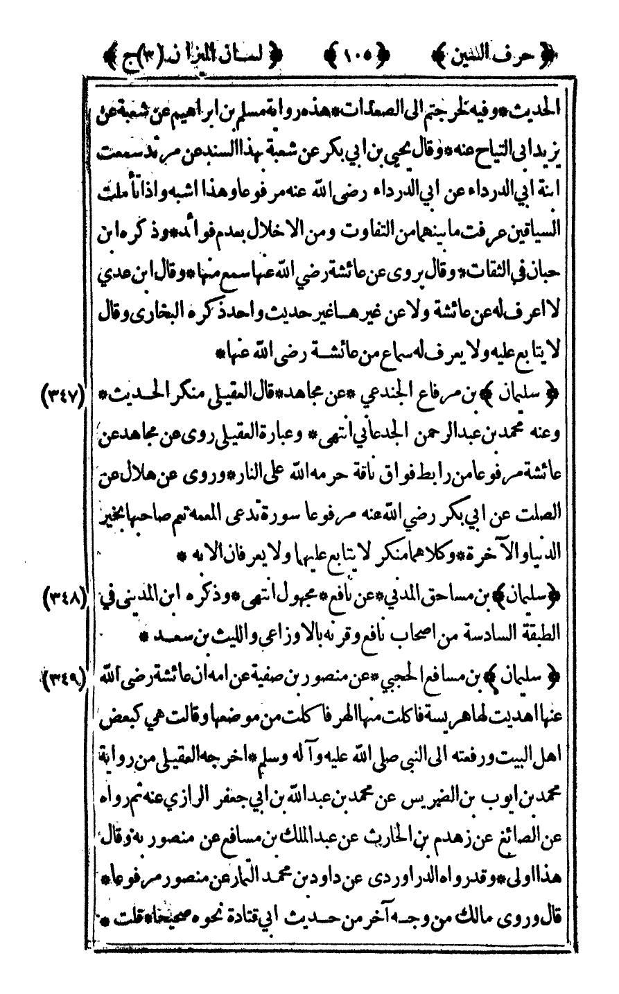 [348] "سليمان" ابن مساحق المدني عن نافع مجهول انتهى وذكره ابن المديني في الطبقة السادسة من أصحاب نافع وقرنه بالأوزاعى والليث بن سعد.