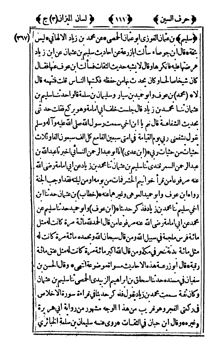 [367] "سليم" بن عثمان الفوزى أبو عثمان الحمصي عن محمد بن زياد الألهاني ليس بثقة قال ابن جوصاء سألت أبا زرعة عن أحاديث سليم بن عثمان عن ابن زياد عرضتها عليه فأنكرها وقال لا يشبه حديث الثقات فسالت بن عوف عنها فقال كان شيخا صالحا وكان يحدث بها من حفظه فكتبها الناس قلت فتتهمه قال لا محمد بن عوف وأبو حميد بن سيار وسليمان ابن سلمة قالوا حدثنا سليم بن عثمان ثنا محمد بن زياد قال جلست خلف أبي أمامة وهو يركع فقلت حدثني بحديث الشفاعة قال نعم يا بن أخي سمعت رسول الله صلى الله عليه وآله وسلم يقول: "يشفعني ربي يوم القيامة في أمتى سبعين ألفا مع كل ألف سبعون ألفا وثلاث حثيات من حثيات ربي" بن عدي أنا أبو عبد الرحمن النسائي أخبرنا عبد الله ابن عبد الرحمن السمرقندي ثنا سليم بن عثمان ثنا محمد بن زياد عن أبي أمامة رضي لله عنه مرفوعا "من قرأ خواتيم الحشر فمات من يومه أو من ليلته فقد أوجب الجنة" رواه بن عوف وأبو حميد العوهي وغيرهما عنه خطاب بن عثمان حدثنا بن أخي سليم ثنا محمد بن زياد فذكر حديثا بن عوف وأبو حميد حدثنا سليم عن محمد عن أبي أمامة رضي الله عنه مرفوعا "من قال الحمد لله مائة مرة كانت له مثل مائة فرس ملجمة في سبيل الله ومن قال سبحان الله وبحمده مائة مرة كانت له مثل مائة بدنة تنحر في مكة ومن قال الله أكبر مائة مرة كانت له مثل عتق مائة رقبة" قال أبو زرعة هذه الأحاديث مسواة موضوعة انتهى وقال الحسن بن سفيان في مسنده حدثنا إسحاق بن إبراهيم الزبيدي الحمصي ثنا سليم بن عثمان وكان ثقة سمعت محمد بن زياد يقول فذكر حديثا في قراءة سورة الإخلاص في ركعتي الفجر وهو غريب من هذا الوجه مشهور من رواية أبي هريرة وغيره وقال ابن حبان في الثقات روى عنه سليمان ابن سلمة الخبائري