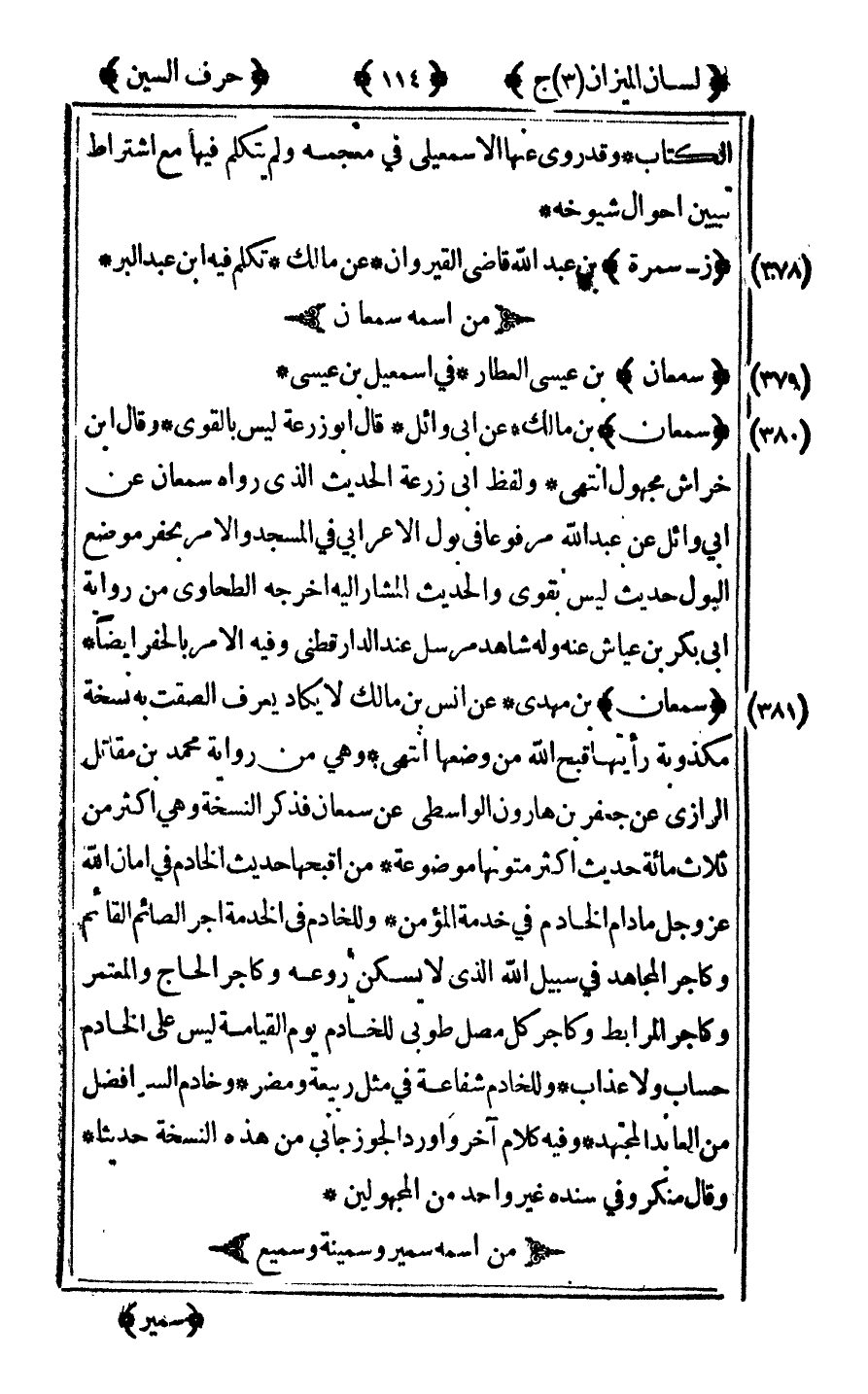 [381] "سليم" ابن مهدي عن أنس بن مالك لا يكاد يعرف الصقت به نسخة مكذوبة رأيتها قبح الله من وضعها انتهى وهي من روية محمد بن مقاتل الرازي عن جعفر بن هارون الواسطي عن سمعان فذكر النسخة وهي أكثر من ثلاث مائة حديث أكثر متونها موضوعة من أقبحها حديث "الخادم في أمان الله عز وجل ما دام الخادم في خدمة المؤمن وللخادم في الخدمة أجر الصائم القائم وكأجر المجاهد في سبيل الله الذي لا يسكن روعه وكأجر الحاج والمعتمر وكأجر المرابط وكأجر كل مصل طوبى للخادم يوم القيامة ليس على الخادم حساب ولا عذاب وللخادم شفاعة في مثل ربيعة ومضر وخادم السر أفضل من العابد المجتهد وفيه" كلام آخر وأورد الجوزجاني من هذه النسخة حديثا وقال منكر وفي سنده غير واحد من المجهولين
