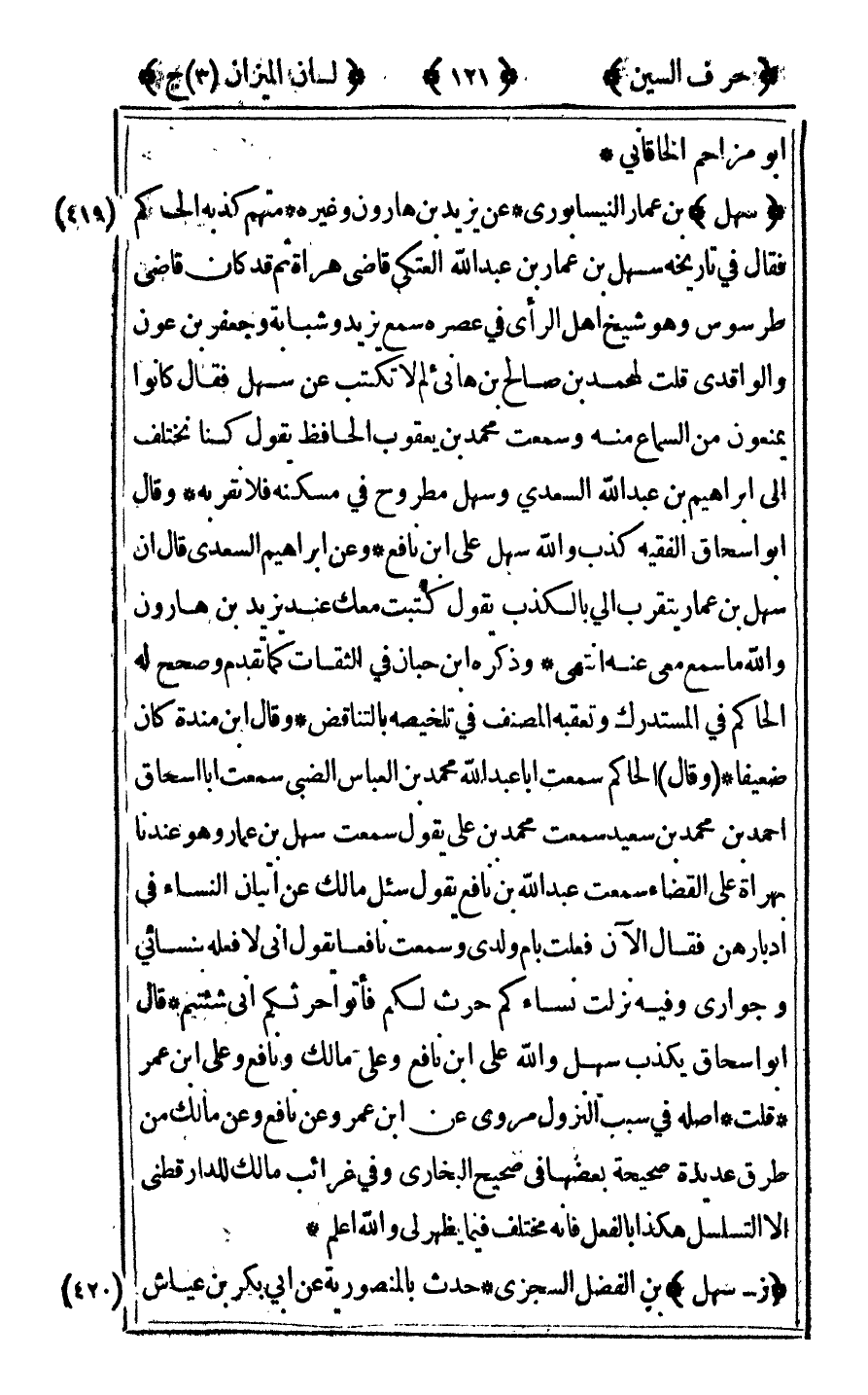 [419] "سهل" بن عمار النيسابوري عن يزيد بن هارون وغيره متهم كذبه الحاكم فقال في تاريخه سهل بن عمار بن عبد الله العتكي قاضى هراة ثم قد كان قاضي طرسوس وهو شيخ أهل الرأي في عصره سمع يزيد وشبابة وجعفر بن عون والواقدي قلت لمحمد بن صالح بن هانئ لم لا تكتب عن سهل فقال كانوا يمنعون من السماع منه وسمعت محمد بن يعقوب الحافظ يقول كنا نختلف إلى إبراهيم بن عبد الله السعدي وسهل مطروح في مسكنه فلا تقربه وقال أبو إسحاق الفقيه كذب والله سهل على بن نافع وعن إبراهيم السعدي قال إن سهل بن عمار يتقرب إلي بالكذب يقول كتبت معك عند يزيد بن هارون والله ما سمع معي عنه انتهى وذكره ابن حبان في الثقات كما تقدم وصحح له الحاكم في المستدرك وتعقبه المصنف في تلخيصه بالتناقض وقال ابن مندة كان ضعيفا وقال الحاكم سمعت أبا عبد الله محمد بن العباس الضبي سمعت أبا إسحاق أحمد بن محمد بن سعيد سمعت محمد بن علي يقول سمعت سهل بن عمار وهو عندنا بهراة على القضاء سمعت عبد الله ابن نافع يقول سئل مالك عن إتيان النساء في أدبارهن فقال الآن فعلت بأم ولدى وسمعت نافعا يقول إنى لأفعله بنسائي وجواري وفيه نزلت نساءكم حرث لكم فأتوا حرثكم أنى شئتم قال أبو إسحاق يكذب سهل والله على بن نافع وعلى مالك ونافع وعلي بن عمر قلت أصله في سبب النزول مروى عن ابن عمر وعن نافع وعن مالك من طرق عديدة صحيحة بعضها في صحيح البخاري وفي غرائب مالك للدارقطني إلا التسلسل هكذا بالفعل فأنه مختلف فيما يظهر والله أعلم.