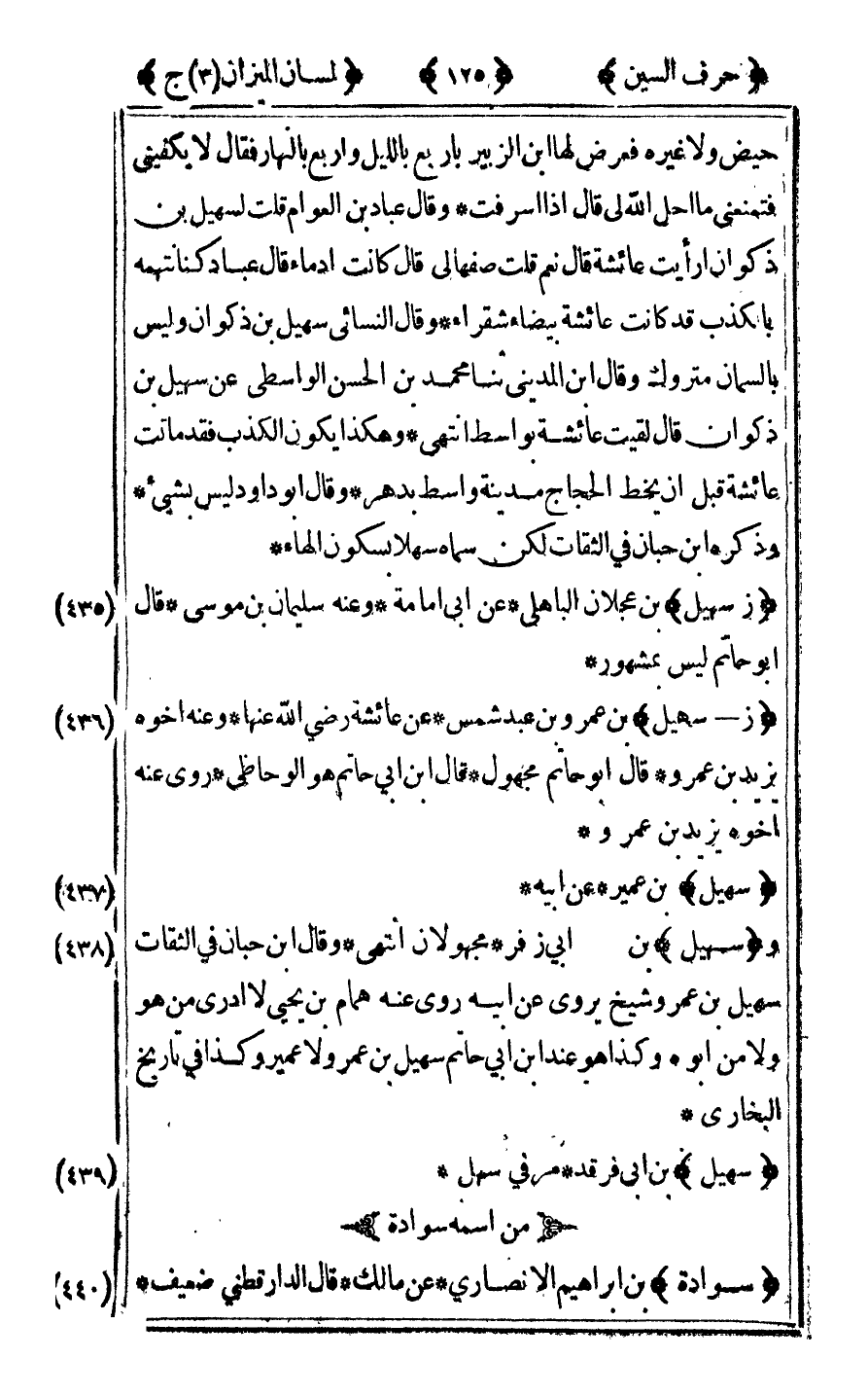 [438] "وسهيل" بن أبي زفر مجهولان انتهى وقال ابن حبان في الثقات سهيل بن عمرو شيخ يروى عن أبيه روى عنه همام بن يحيى لا أدري من هو ولا من أبوه وكذا هو عند بن أبي حاتم سهيل بن عمرو لا عمير وكذا في تاريخ البخاري.