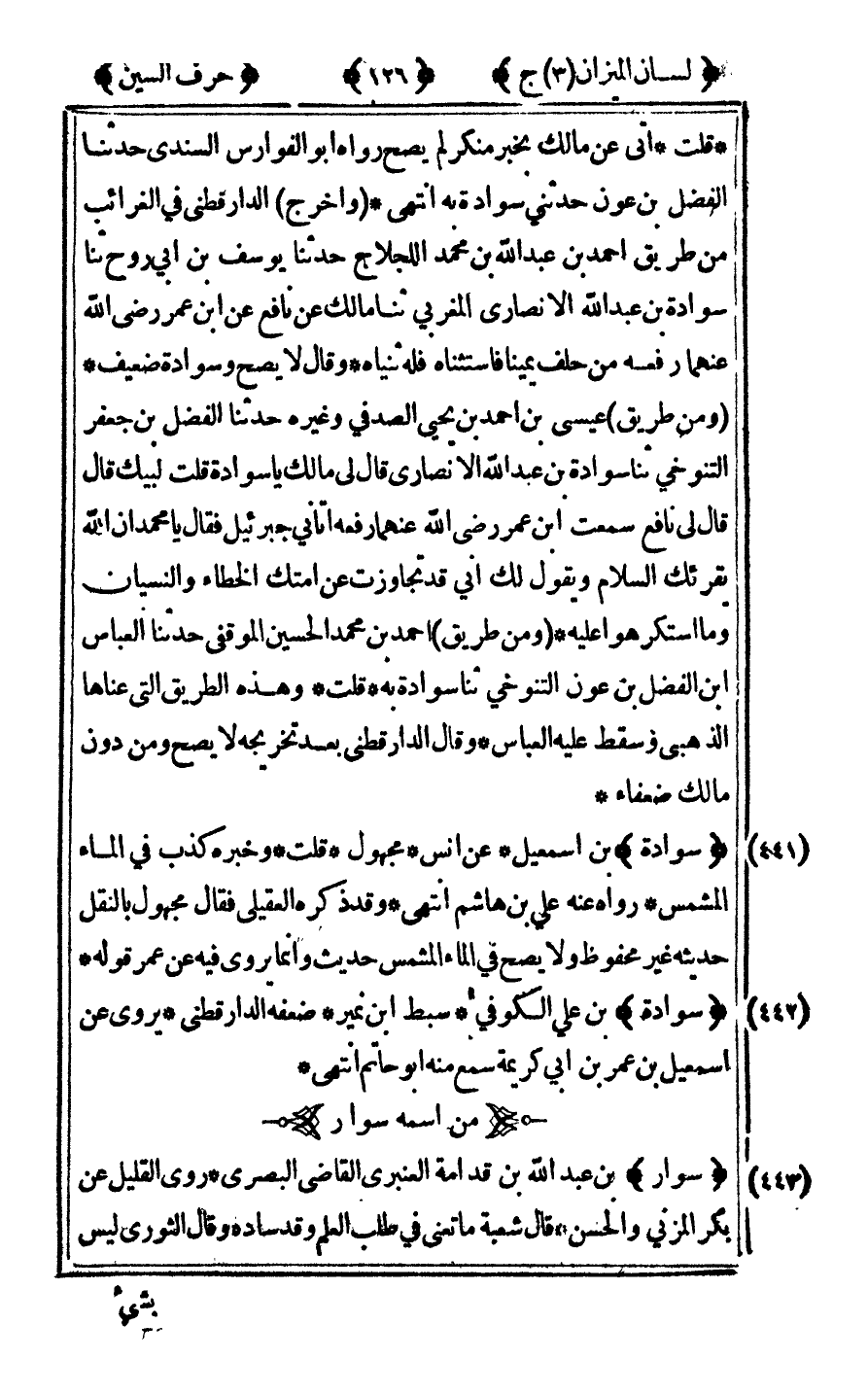 [442] "سوادة" بن علي الكوفي سبط بن نمير ضعفه الدارقطني يروى عن إسماعيل بن عمر بن أبي كريمة سمع منه أبو حاتم انتهى.