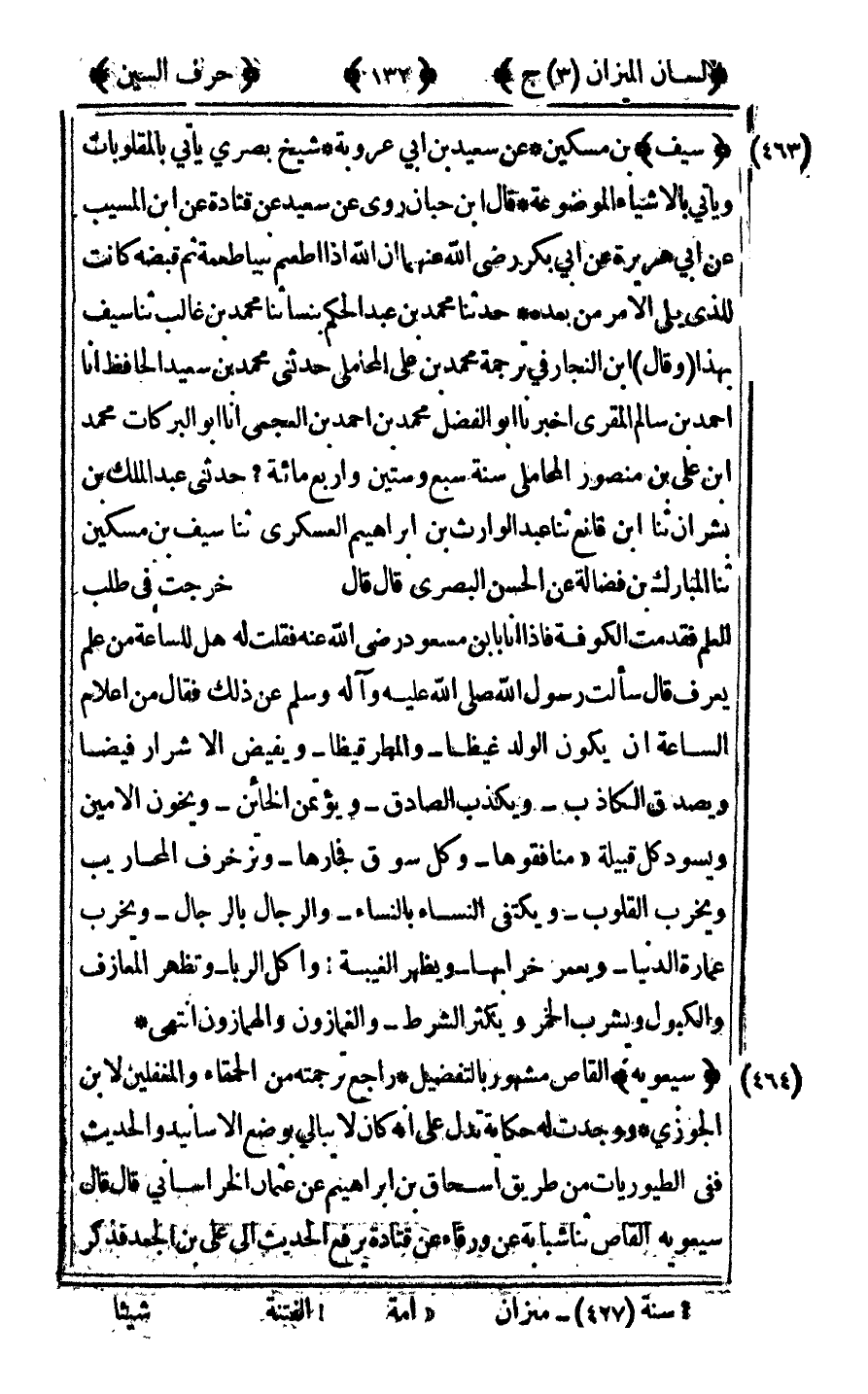 [463] "سيف" بن مسكين عن سعيد بن أبي عروبة شيخ بصري يأتي بالمقلوبات ويأتي بالأشياء الموضوعة قال ابن حبان روى عن سعيد عن قتادة عن ابن المسيب عن أبي هريرة عن أبي بكر رضي الله عنهما "أن الله إذا اطعم نبيا طعمة ثم قبضه كانت للذي يلي الأمر من بعده" حدثنا محمد بن عبد الحكم بنسا ثنا محمد بن غالب ثنا سيف بهذا وقال ابن النجار في ترجمة محمد بن علي المحاملي حدثني محمد بن سعيد الحافظ أنا أحمد بن سالم المقري أخبرنا أبو الفضل محمد بن أحمد بن العجمي أنا أبو البركات محمد بن علي بن منصور المحاملي سنة سبع وستين وأربع مائة1 حدثني عبد الملك بن بشران ثنا بن قانع ثنا عبد الوارث بن إبراهيم العسكري ثنا سيف بن مسكين ثنا المبارك بن فضالة عن الحسن البصري قال: قال خرجت في طلب العلم فقدمت الكوفة فإذا أنا بابن مسعود رضي الله عنه فقلت له هل للساعة من علم يعرف قال سألت رسول الله صلى الله عليه وآله وسلم عن ذلك فقال: "من أعلام الساعة أن يكون الولد غيظا والمطر قيظا ويفيض الأشرار فيضا ويصدق الكاذب ويكذب الصادق ويؤتمن الخائن ويخون الأمين ويسود كل قبيلة2 منافقوها وكل سوق فجارها وتزخرف المحاريب ويخرب القلوب ويكتفي النساء بالنساء والرجال بالرجال ويخرب عمارة الدنيا ويعمر خرابها ويظهر الغيبة3 وأكل الربا وتظهر المعازف والكبول ويشرب الخمر ويكثر الشرط والغمازون والهمازون" انتهى.