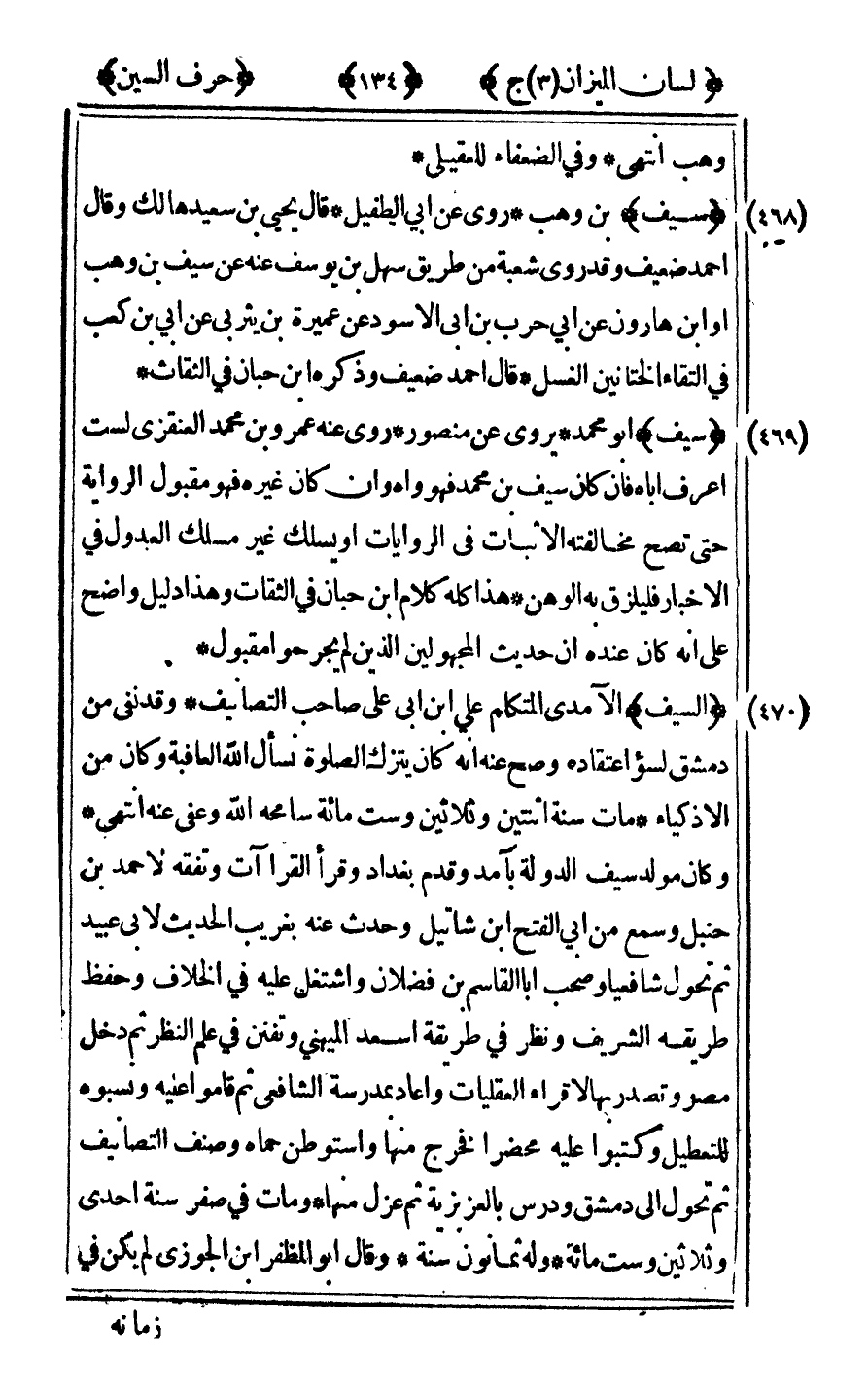 [469] "سيف" أبو محمد يروى عن منصور روى عنه عمرو بن محمد العنقزي لست اعرف أباه فان كان سيف بن محمد فهو واه وان كان غيره فهو مقبول الراوية حتى تصح مخالفته الأثبات في الروايات أو يسك غير مسلك العدول في الأخبار فليلزق به الوهن هذا كله كلام بن حبان في الثقات وهذا دليل واضح على أنه كان عنده ان حديث المجهولين الذين لم يجرحوا مقبول.
