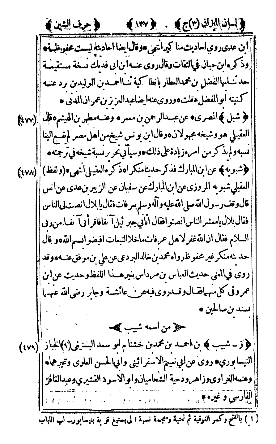 [477] "شبل" المصري عن عبد الرحمن بن معمر وعنه مطهر بن الهيثم قال العقيلي هو وشيخه مجهولان وقال ابن يونس شيخ من أهل مصر لم يقع إلينا نسبه ولم يذكر من امره زيادة على ذلك وسيأتى تحرير نسبة شيخه في ترجمته.