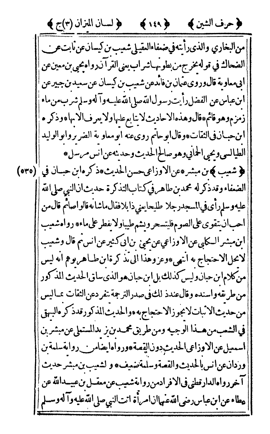 [535] "شعيب" بن مبشر عن الأوزاعي حسن الحديث ذكره ابن حبان في الضعفاء وقد ذكر له محمد بن طاهر في كتاب التذكرة حديث أن النبي صلى الله عليه وآله وسلم رآى في المسجد رجلا طليحا يعنى ذابلا فقال: "ما شأنه"؟ قالوا صائم قال: "من أحب أن يتقوى على الصوم فليتسحر ويشم طيبا ولا يفطر على ماء" رواه شعيب بن مبشر الكلبي عن الأوزاعي عن يحيى بن أبي كثير عن أنس ثم قال وشعيب لا يحل الاحتجاج به انتهى وعزو هذا إلى تذكرة بن طاهر يوهم أنه ليس من كلام ابن حبان وليس كذلك بل ابن حبان هو الذي ساق الحديث المذكور من طريقه وأسنده وقال عند ذلك في صدر الترجمة يتفرد عن الثقات بما ليس من حديث الأثبات لا يجوز الاحتجاج به والحديث المذكور قد ذكره البيهقي في الشعب من هذا الوجه ومن طريق محمد بن يزيد المستملى عن مبشر بن إسماعيل عن الأوزاعي الحديث دون القصة ورواه أيضا من رواية سلمة بن وردان عن أنس بالحديث والقصة وسلمة ضعيف ولشعيب بن مبشر حديث آخر رواه الدارقطني في الإفراد من رواية شعيب عن معقل بن عبيد الله عن عطاء عن ابن عباس رضي الله عنهما أن امرأة أتت النبي صلى الله عليه وآله وسلم