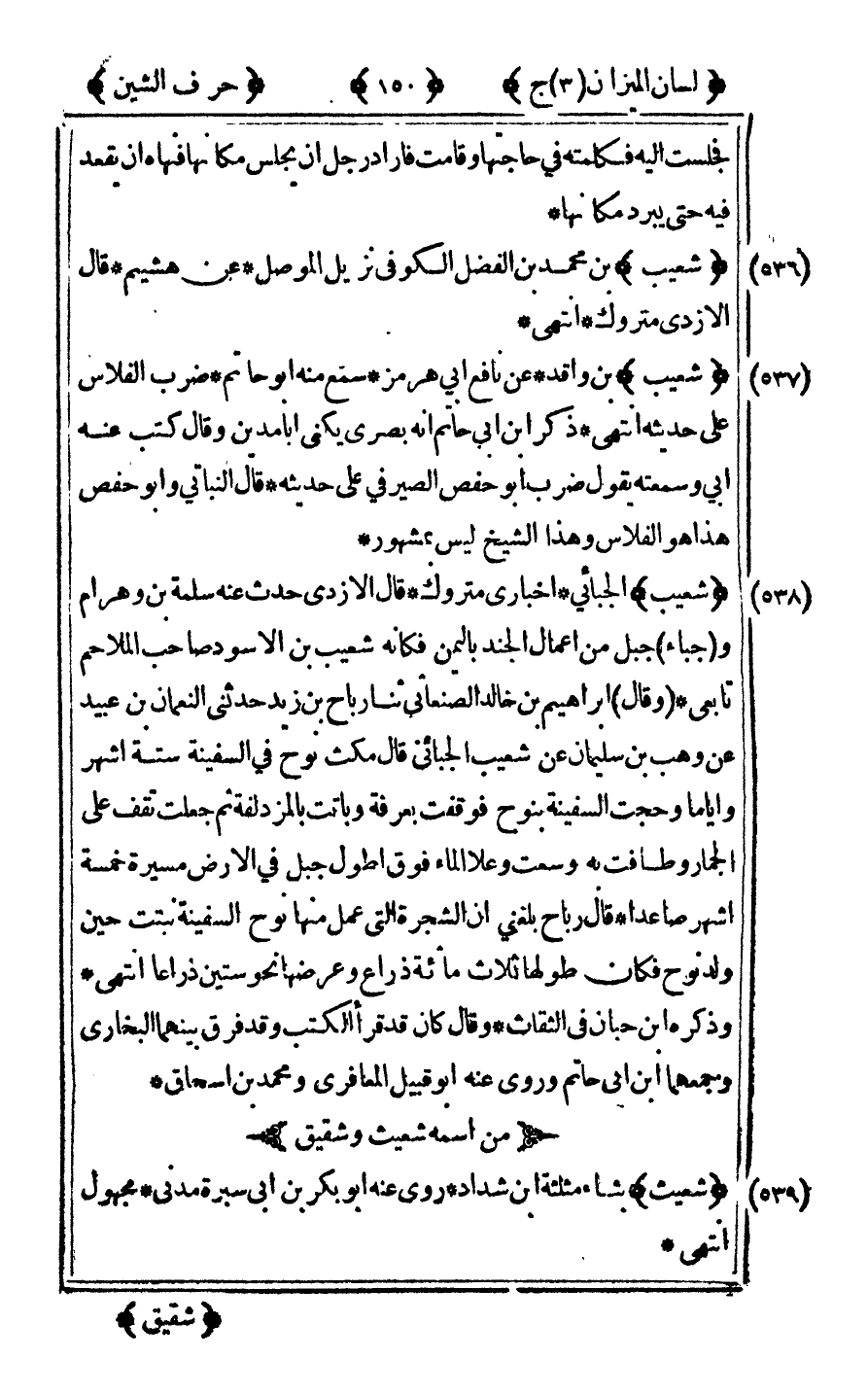 [538] "شعيب" الجبائي إخباري متروك قال الأزدي حدث عنه سلمة بن وهرام وجباء جبل من أعمال الجند باليمن فكأنه شعيب بن الأسود صاحب الملاحم تابعي وقال إبراهيم بن خالد الصنعاني ثنا رباح بن زيد حدثني النعم أن ابن عبيد عن وهب بن سليمان عن شعيب الجبائي قال مكث نوح في السفينة ستة أشهر وأياما وحجت السفينة بنوح فوقفت بعرفة وباتت بالمزدلفة ثم جعلت تقف على الجمار وطافت به وسعت وعلا الماء فوق أطول جبل في الأرض مسيرة خمسة أشهر صاعدا قال رباح بلغني أن الشجرة التي عمل منها نوح السفينة نبتت حين ولد نوح فكان طولها ثلاث مائة ذراع وعرضها نحو ستين ذراعا انتهى وذكره ابن حبان في الثقات وقال كان قد قرأ الكتب وقد فرق بينهما البخاري وجمعهما بن أبي حاتم وروى عنه أبو قبيل المعافري ومحمد بن إسحاق.