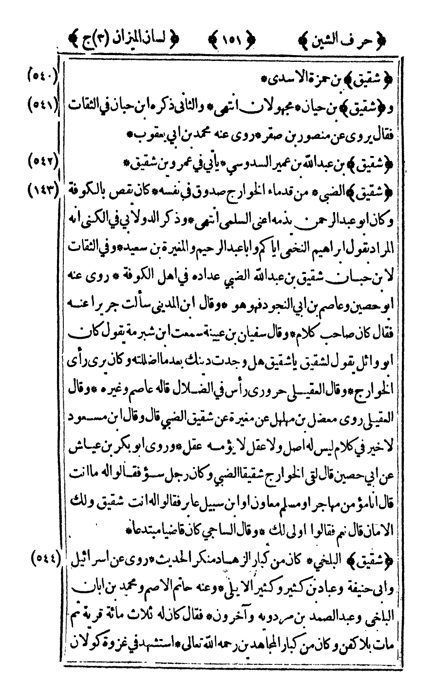 [543] "شقيق" الضبي من قدماء الخوارج صدوق في نفسه كان يقص بالكوفة وكان أبو عبد الرحمن يذمه أعنى السلمي انتهى وذكر الدولابي في الكنى أنه المراد بقول إبراهيم النخعي إياكم وأبا عبد الرحيم والمغيرة بن سعيد وفي الثقات لابن حبان شقيق بن عبد الله الضبي عداده في أهل الكوفة روى عنه أبو حصين وعاصم بن أبي النجود فهو هو وقال ابن المديني سألت جريرا عنه فقال كان صاحب كلام وقال سفي أن ابن عيينة سمعت ابن شبرمة يقول كان أبو وائل يقول لشقيق يا شقيق هل وجدت دينك بعدما أضللته وكان يرى رأي الخوراج وقال العقيلي حروري رأس في الضلال قاله عاصم وغيره وقال العقيلي روى معضل بن مهلهل عن مغيرة عن شقيق الضبي قال وقال ابن مسعود لا خير في كلام ليس له أصل ولا عقل لا يؤمه عقل وروى أبو بكر بن عياش عن أبي حصين قال لقي الخوارج شقيقا الضبي وكان رجل سوء فقالوا له ما أنت قال أنا مؤمن مهاجر أو مسلم معاون أو ابن سبيل عابر فقالوا له أنت شقيق ولك الأمان قال نعم فقالوا أولى لك وقال الساجي كان قاضيا مبتدعا.