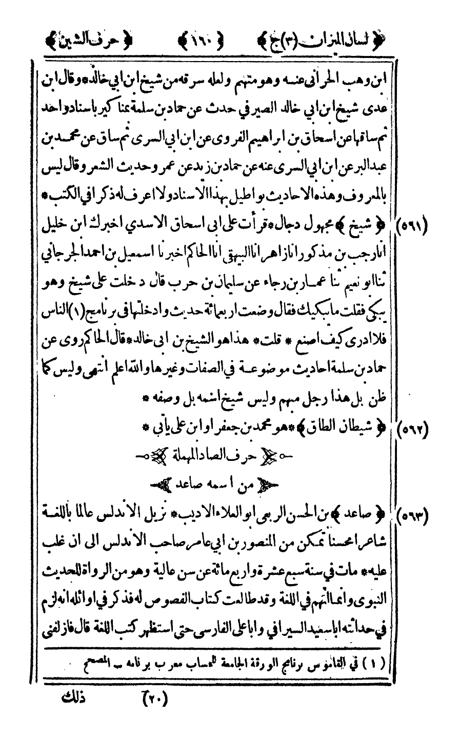 [561] "شيخ" مجهول دجال قرأت على أبي إسحاق الأسدي أخبرك بن خليل أنا رجب بن مذكور أنا زاهر أنا البيهقي أنا الحاكم أخبرنا إسماعيل بن أحمد الجرجاني ثنا أبو نعيم ثنا عمر بن رجاء عن سليمان ابن حرب قال دخلت على شيخ وهو يبكي فقلت ما يبكيك فقال وضعت أربعمائة حديث وأدخلتها في برنامج1 الناس فلا أدري كيف اصنع قلت هذا هو الشيخ بن أبي خالد قال الحاكم روى عن حماد بن سلمة أحاديث موضوعة في الصفات وغيرها والله أعلم انتهى وليس كما ظن بل هذا رجل مبهم وليس شيخ اسمه بل وصفه.