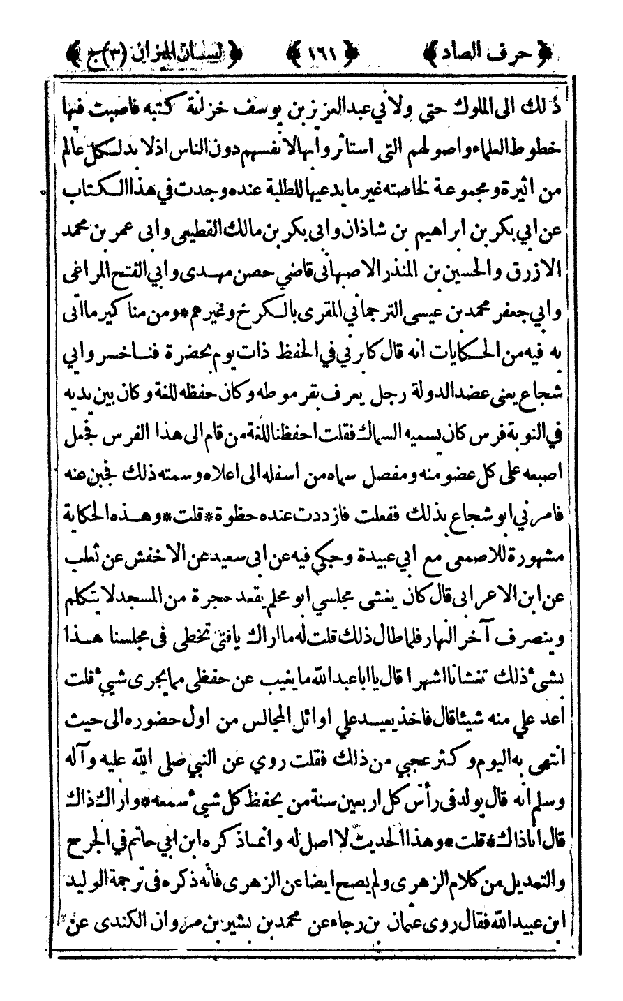 ذلك إلى الملوك حتى ولانى عبد العزيز بن يوسف خزانة كتبه فأصبت فيها خطوط العلماء وأصولهم التي استأثروا بها لأنفسهم دون الناس إذ لا بد لكل عالم من اثيرة ومجموعة لخاصته غير ما يدعيها للطلبة عنده وجدت في هذا الكتاب عن أبي بكر بن إبراهيم بن شاذان وأبي بكر بن مالك القطيعي وأبي عمر بن محمد الأزرق والحسين بن المنذر الأصبهاني قاضي حصن مهدي وأبي الفتح المراغي وأبي جعفر محمد بن عيسى الترجماني المقري بالكرخ وغيرهم ومن مناكير ما أتى به فيه من الحكايات أنه قال كابرني في الحفظ ذات يوم بحضرة فناخسر وأبي شجاع يعنى عضد الدولة رجل يعرف بقرموطه وكان حفظه للغة وكان بين يديه في النوبة فرس كان يسميه السماك فقلت أحفظنا للغة من قام إلى هذا الفرس فجعل أصبعه على كل عضو منه ومفصل سماه من أسفله إلى أعلاه وسمته ذلك فجبن عنه فأمرني أبو شجاع بذلك ففعلت فازددت عنده حظوة قلت وهذه الحكاية مشهورة للأصمعي مع أبي عبيدة وحكي فيه عن أبي سعيد عن الأخفش عن ثعلب عن ابن الأعرابي قال كان يغشى مجلسي أبو محلم يقعد حجرة من المسجد لا يتكلم وينصرف آخر النهار فلما طال ذلك قلت له ما أراك يا فتى تخطى في مجلسنا هذا بشيء ذلك تغشانا أشهرا قال يا أبا عبد الله ما يغيب عن حفظي مما يجرى شيء قلت أعد علي منه شيئا قال فأخذ يعيد علي أوائل المجالس من أول حضوره إلى حيث انتهى به اليوم وكثر عجبى من ذلك فقلت روى عن النبي صلى الله عليه وآله وسلم أنه قال: يولد في رأس كل أربعين سنة من يحفظ كل شيء سمعه وأراك ذاك قال أنا ذاك قلت وهذا الحديث لا أصل له وإنما ذكره ابن أبي حاتم في الجرح والتعديل من كلام الزهري ولم يصح أيضا عن الزهري فأنه ذكره في ترجمة الوليد بن عبيد الله فقال روى عثمان ابن رجاء عن محمد بن بشير بن مروان الكندي عن