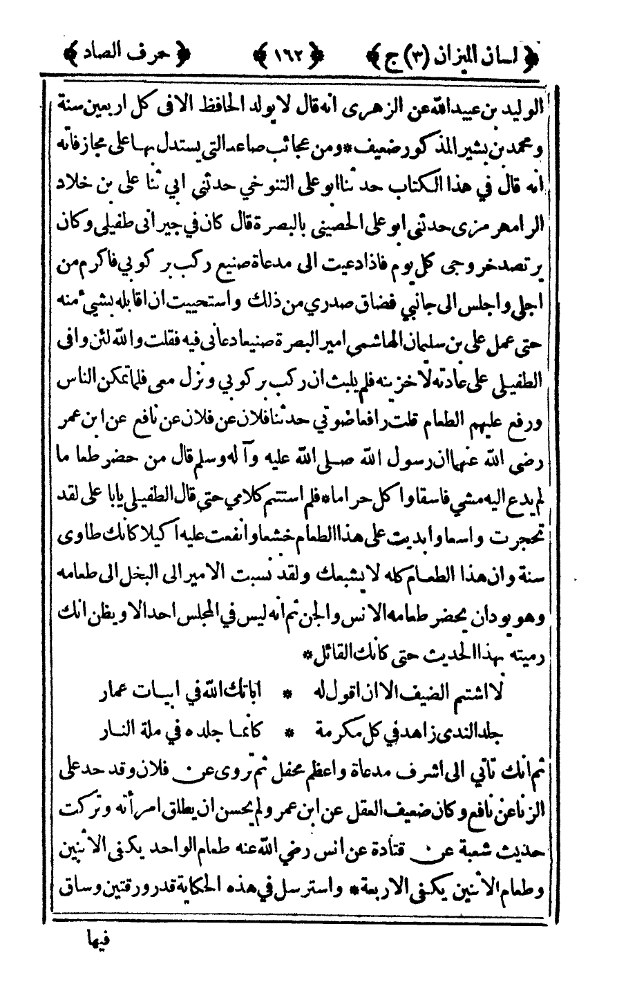 الوليد بن عبيد الله عن الزهري أنه قال لا يولد الحافظ إلا في كل أربعين سنة ومحمد بن بشير المذكور ضعيف ومن عجائب صاعد التي يستدل بها على مجاز فاته أنه قال في هذا الكتاب حدثنا أبو علي التنوخي حدثني أبي ثنا علي بن خلاد الرامهرمزي حدثني أبو علي الحصيني بالبصرة قال كان في جيراني طفيلي وكان يرتصد خروجي كل يوم فإذا دعيت إلى مدعاة صنيع ركب بركوبي فأكرم من أجلى واجلس إلى جانبي فضاق صدري من ذلك واستحييت أن أقابله بشيء منه حتى عمل على بن سليمان الهاشمي أمير البصرة صنيعا دعاني فيه فقلت والله لئن وافى الطفيلي على عادته لأخزينه فلم يلبث أن ركب بركوبي ونزل معي فلما تمكن الناس ورفع عليهم الطعام قلت رافعا صوتي حدثنا فلان عن فلان عن نافع عن ابن عمر رضي الله عنهما أن رسول الله صلى الله عليه وآله وسلم قال: "من حضر طعاما لم يدع إليه مشي فاسقا واكل حراما" فلم استتم كلامي حتى قال الطفيلي يا أبا علي لقد تحجرت واسعا وأبديت على هذا الطعام خشعا وأنفعت عليه أكيلا كأنك طاوي سنة وأن هذا الطعام كله لا يشبعك ولقد نسبت الأمير إلى البخل إلى طعامه وهو يود أن يحضر طعامه الإنس والجن ثم أنه ليس في المجلس أحد إلا ويظن أنك رميته بهذا الحديث حتى كأنك القائل.